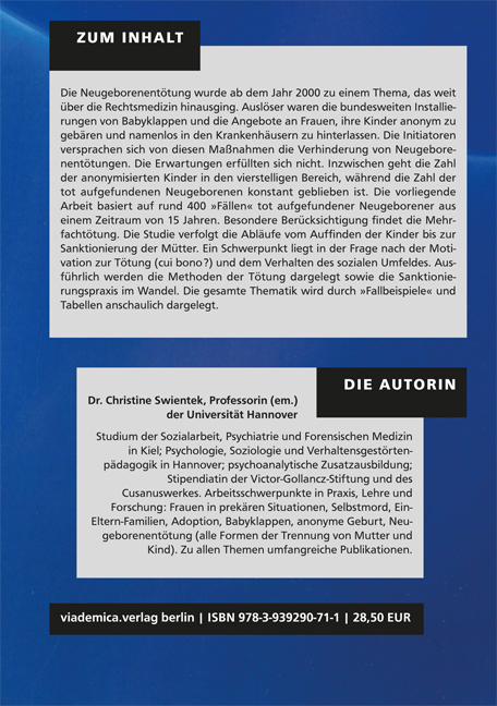 Dr. Christine Swientek, Professorin (em.) der Universität Hannover: Studium der Sozialarbeit, Psychiatrie und Forensischen Medizin in Kiel; Psychologie, Soziologie und Verhaltensgestörtenpädagogik in Hannover; psychoanalytische Zusatzausbildung; Stipendiatin der Victor-Gollancz-Stiftung und des Cusanuswerkes. Arbeitsschwerpunkte in Praxis, Lehre und Forschung: Frauen in prekären Situationen, Selbstmord, Ein-Eltern-Familien, Adoption, Babyklappen, anonyme Geburt, Neugeborenentötung (alle Formen der Trennung von Mutter und Kind). Zu allen Themen umfangreiche Publikationen.