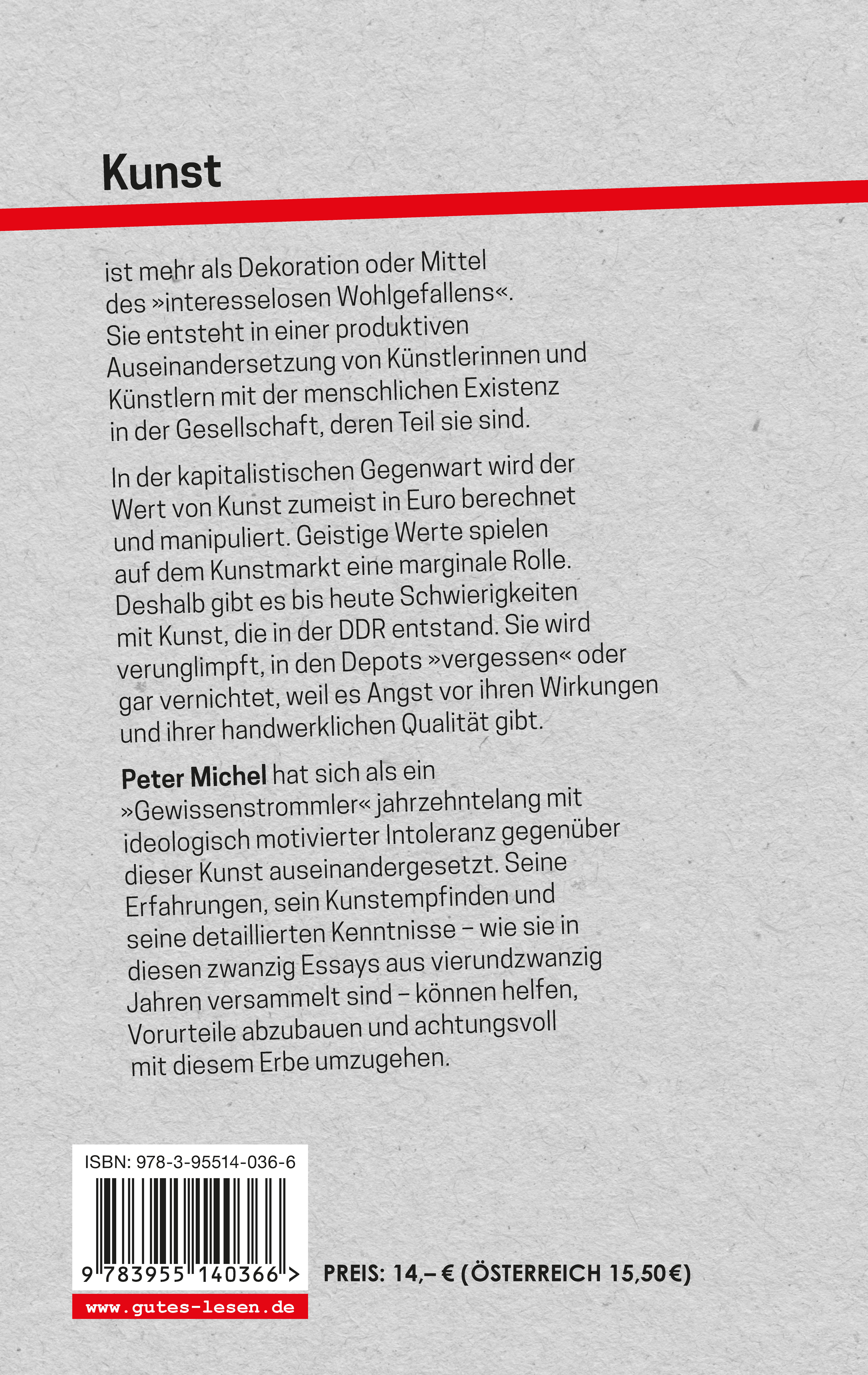 Peter Michel hat sich als ein »Gewissenstrommler« jahrzehntelang mit ideologisch motivierter Intoleranz gegenüber dieser Kunst auseinandergesetzt. Seine Erfahrungen, sein Kunstempfinden und seine detaillierten Kenntnisse – wie sie in diesen zwanzig Essays aus vierundzwanzig Jahren versammelt sind – können helfen, Vorurteile abzubauen und achtungsvoll mit diesem Erbe umzugehen.