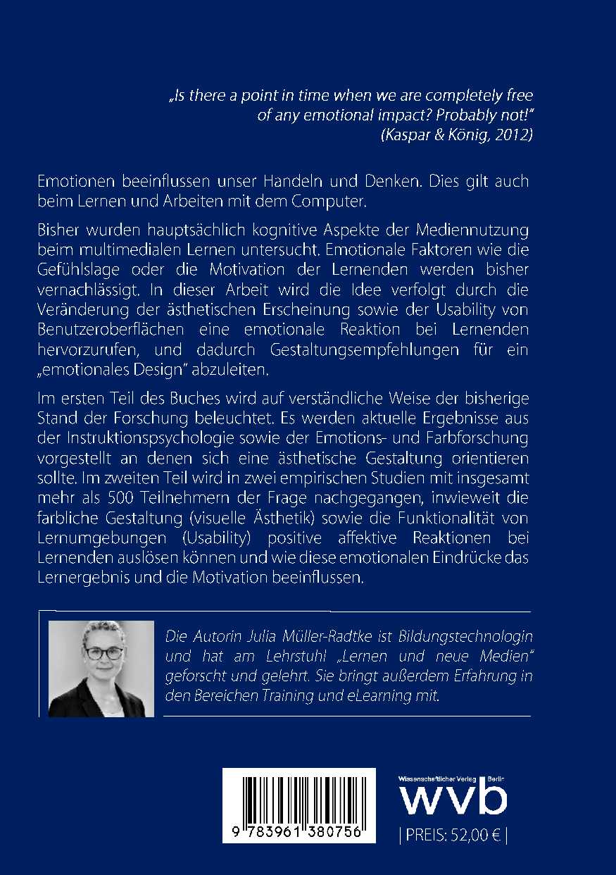 Im ersten Teil des Buches wird auf verständliche Weise der bisherige Stand der Forschung beleuchtet. Es werden aktuelle Ergebnisse aus der Instruktionspsychologie sowie der Emotions- und Farbforschung vorgestellt an denen sich eine ästhetische Gestaltung orientieren sollte. Im zweiten Teil wird in zwei empirischen Studien mit insgesamt mehr als 500 Teilnehmern der Frage nachgegangen, inwieweit die farbliche Gestaltung (visuelle Ästhetik) sowie die Funktionalität von Lernumgebungen (Usability) positive affektive Reaktionen bei Lernenden auslösen können und wie diese emotionalen Eindrücke das Lernergebnis und die Motivation beeinflussen.