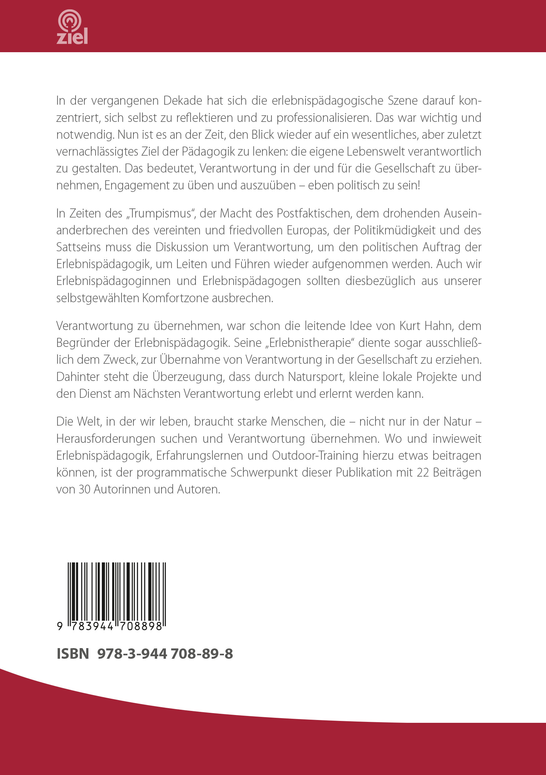 In der vergangenen Dekade hat sich die erlebnispädagogische Szene darauf konzentriert, sich selbst zu reflektieren und zu professionalisieren. Das war wichtig und notwendig. Nun ist es an der Zeit, den Blick wieder auf ein wesentliches, aber zuletzt vernachlässigtes Ziel der Pädagogik zu lenken: die eigene Lebenswelt verantwortlich zu gestalten. Das bedeutet, Verantwortung in der und für die Gesellschaft zu übernehmen, Engagement zu üben und auszuüben - eben politisch zu sein!In Zeiten des "Trumpismus", der Macht des Postfaktischen, dem drohenden Auseinanderbrechen des vereinten und friedvollen Europas, der Politikmüdigkeit und des Sattseins muss die Diskussion um Verantwortung, um den politischen Auftrag der Erlebnispädagogik, um Leiten und Führen wieder aufgenommen werden. Auch wir Erlebnispädagoginnen und Erlebnispädagogen sollten diesbezüglich aus unserer selbstgewählten Komfortzone ausbrechen. Verantwortung zu übernehmen, war schon die leitende Idee von Kurt Hahn, dem Begründer der Erlebnispädagogik. Seine "Erlebnistherapie" diente sogar ausschließlich dem Zweck, zur Übernahme von Verantwortung in der Gesellschaft zu erziehen. Dahinter steht die Überzeugung, dass durch Natursport, kleine lokale Projekte und den Dienst am Nächsten Verantwortung erlebt und erlernt werden kann.Die Welt, in der wir leben, braucht starke Menschen, die - nicht nur in der Natur - Herausforderungen suchen und Verantwortung übernehmen. Wo und inwieweit Erlebnispädagogik, Erfahrungslernen und Outdoor-Training hierzu etwas beitragen können, ist der programmatische Schwerpunkt dieser Publikation mit 22 Beiträgen von 30 Autorinnen und Autoren.