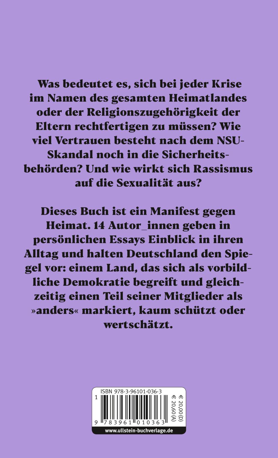 Dieses Buch ist ein Manifest gegen Heimat – einem völkisch verklärten Konzept, gegen dessen Normalisierung sich 14 deutschsprachige Autor_innen wehren. Zum einjährigen Bestehen des sogenannten „Heimatministeriums“ sammeln Fatma Aydemir und Hengameh Yaghoobifarah schonungslose Perspektiven auf eine rassistische und antisemitische Gesellschaft. In persönlichen Essays geben sie Einblick in ihren Alltag und halten Deutschland den Spiegel vor: einem Land, das sich als vorbildliche Demokratie begreift und gleichzeitig einen Teil seiner Mitglieder als »anders« markiert, kaum schützt oder wertschätzt.