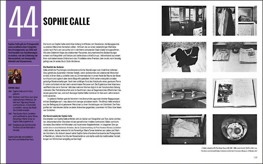 50 Künstlerinnen, die man kennen sollte, enthält Texte und Abbildungen unter anderem zu Marina Abramovic, Louise Bourgeois, Sophie Calle, Camille Claudel, Isa Genzken, Eva Hesse, Hannah Höch, Jenny Holzer, Frida Kahlo, Käthe Kollwitz, Tamara de Lempicka, Maria Sibylla Merian, Paula Modersohn-Becker, Gabriele Münter, Niki de Saint Phalle und Élisabeth Vigée-Lebrun.