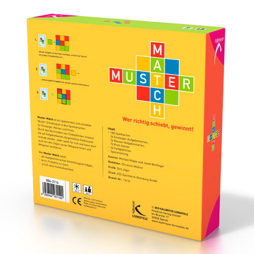 Wer richtig schiebt, gewinnt!Muster-Match ist ein Muster-Schiebespiel in drei Spielvariationen. Durch das Verschieben bunter Spielfeldplättchen sollen die auf Aufgabenkarten abgebildeter Muster erzeugt werden. Wer aufmerksam die Züge der anderen Mitspieler verfolgt, kann die Muster der eigenen Aufgabenkarten entdecken und dabei Punkte ergattern.Ein schnelles Spiel für Einsteiger, Könner und Profis ab fünf Jahren, das die Aufmerksamkeit und das geometrische Vorstellungsvermögen auf spielerische Weise fördert.