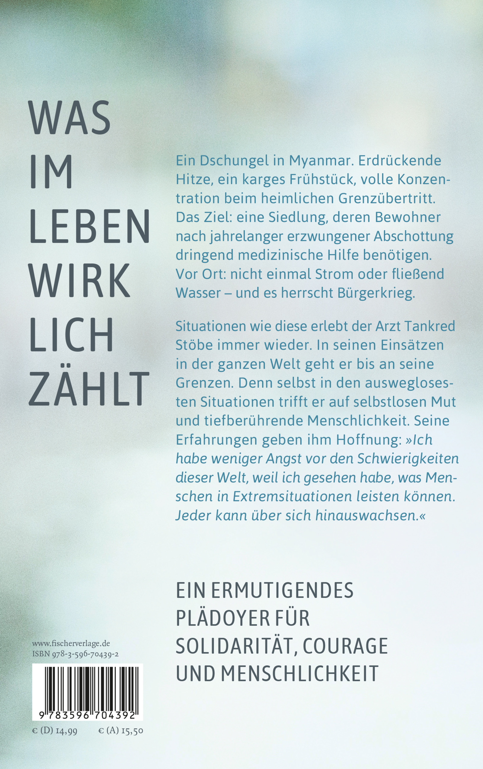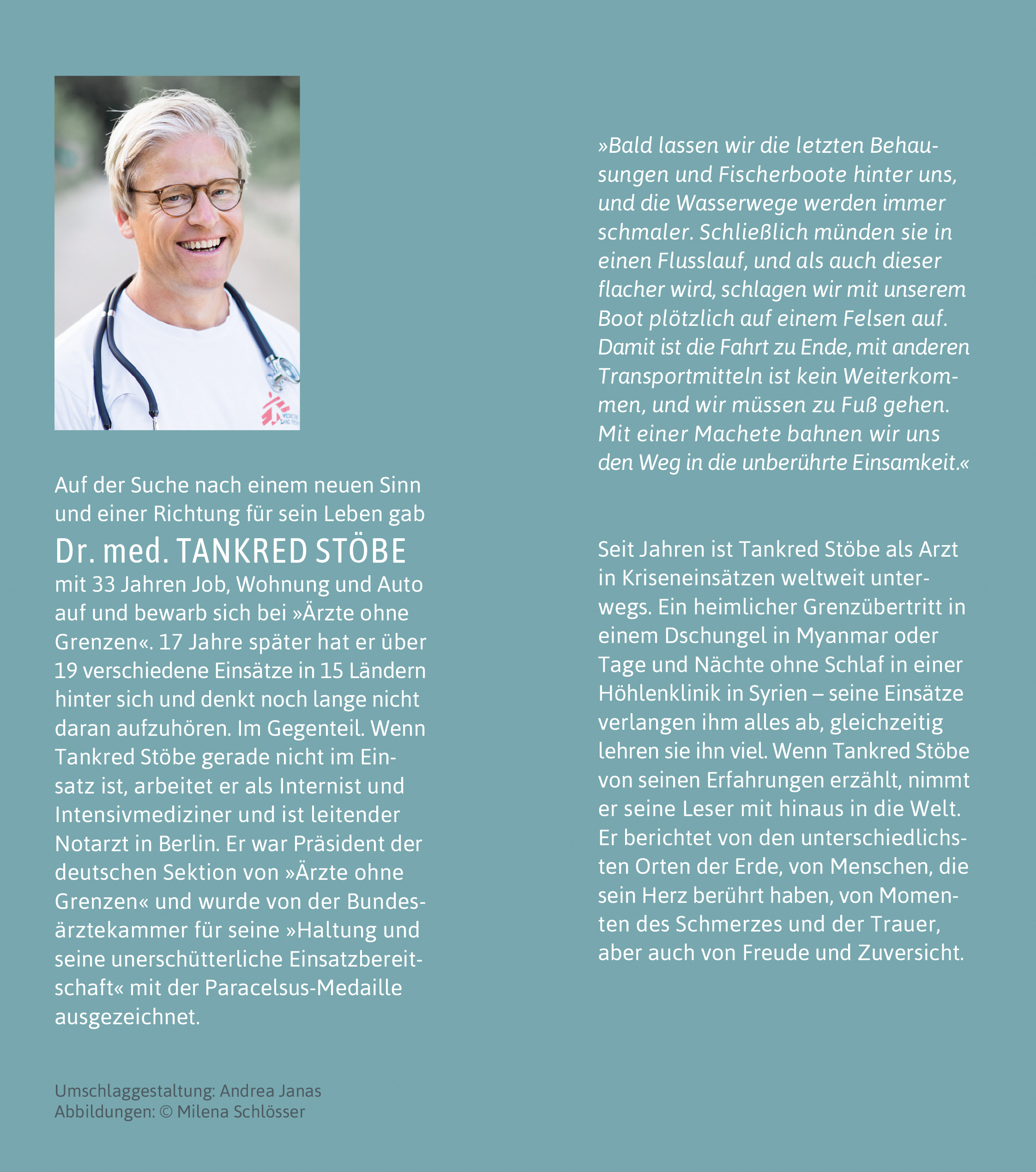 Auf der Suche nach einem neuen Sinn und einer Richtung für sein Leben gab Dr. med. Tankred Stöbe mit 33 Jahren Job, Wohnung und Auto auf und bewarb sich bei »Ärzte ohne Grenzen«. 17 Jahre später hat er über 19 verschiedene Einsätze in 15 Ländern hinter sich und denkt noch lange nicht daran aufzuhören. Im Gegenteil. Wenn Tankred Stöbe gerade nicht im Einsatz ist, arbeitet er als Internist und Intensivmediziner und ist leitender Notarzt in Berlin. Er war Präsident der deutschen Sektion von »Ärzte ohne Grenzen« und wurde von der Bundesärztekammer für seine »Haltung und seine unerschütterliche Einsatzbereitschaft« mit der Paracelsus-Medaille ausgezeichnet.