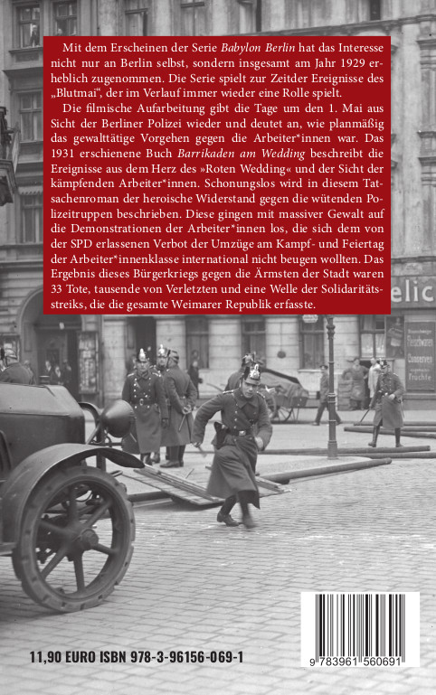Mit dem Erscheinen der Serie Babylon Berlin hat das Interesse nicht nur an Berlin selbst, sondern insgesamt am Jahr 1929 erheblich zugenommen. Die Serie spielt zur Zeit der Ereignisse des "Blutmai", der im Verlauf immer wieder eine Rolle spielt.Die filmische Aufarbeitung gibt die Tage um den 1. Mai aus Sicht der Berliner Polizei wieder und deutet an, wie planmäßig das gewalttätige Vorgehen gegen die Arbeiter*innen war. Das 1931 erschienene Buch Barrikaden am Wedding beschreibt die Ereignisse aus dem Herz des »Roten Wedding« und der Sicht der kämpfenden Arbeiter*innen. Schonungslos wird in diesem Tatsachenroman der heroische Widerstand gegen die wütenden Polizeitruppen beschrieben. Diese gingen mit massiver Gewalt auf die Demonstrationen der Arbeiter*innen los, die sich dem von der SPD erlassenen Verbot der Umzüge am Kampf- und Feiertag der Arbeiter*innenklasse international nicht beugen wollten. Das Ergebnis dieses Bürgerkriegs gegen die Ärmsten der Stadt waren 33 Tote, tausende von Verletzten und eine Welle der Solidaritätsstreiks, die die gesamte Weimarer Republik erfasste.