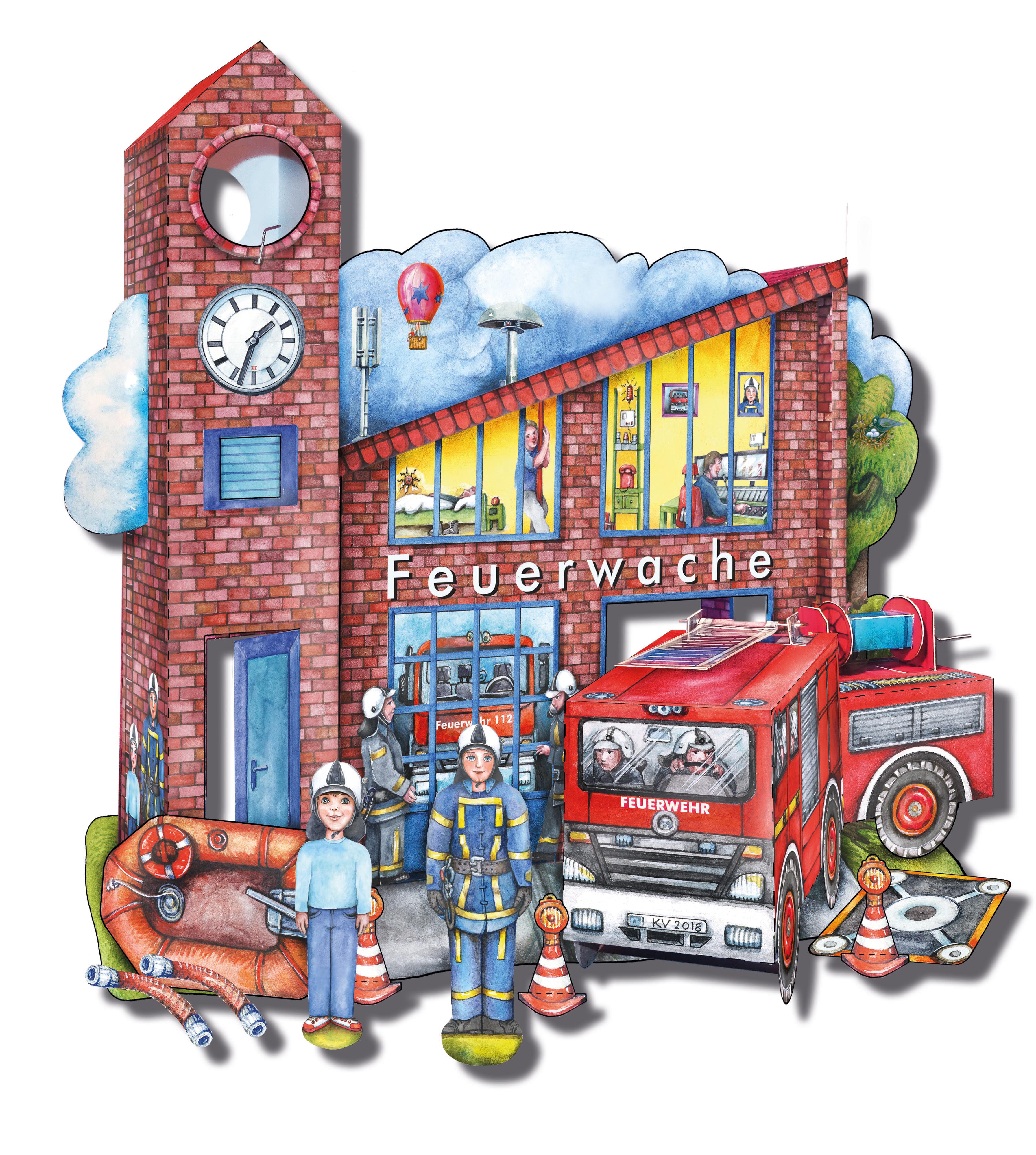 Bastelbogen Feuerwache zum Ausschneiden, Basteln und Bespielen aus robustem Papier für daheim und unterwegs.