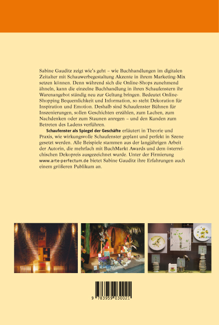 Sabine Gauditz zeigt wie's geht - wie Buchhandlungen im digitalen Zeitalter mit Schauwerbegestaltung Akzente in ihrem Marketing-Mix setzen können. Denn während sich die Online-Shops zunehmend ähneln, kann die einzelne Buchhandlung in ihren Schaufenstern ihr Warenangebot ständig neu zur Geltung bringen. Bedeutet Online-Shopping Bequemlichkeit und Information, so steht Dekoration für Inspiration und Emotion. Deshalb sind Schaufenster Bühnen für Inszenierungen, sollen Geschichten erzählen, zum Lachen, zum Nachdenken oder zum Staunen anregen - und den Kunden zum Betreten des Ladens verführen.Schaufenster als Spiegel der Geschäfte erläutert in Theorie und Praxis, wie wirkungsvolle Schaufenster geplant und perfekt in Szene gesetzt werden. Alle Beispiele stammen aus der langjährigen Arbeit der Autorin, die mehrfach mit BuchMarkt Awards und dem österreichischen Dekopreis ausgezeichnet wurde. Unter der Firmierung www.arte-perfectum.de bietet Sabine Gauditz ihre Erfahrungen auch einem größeren Publikum an.