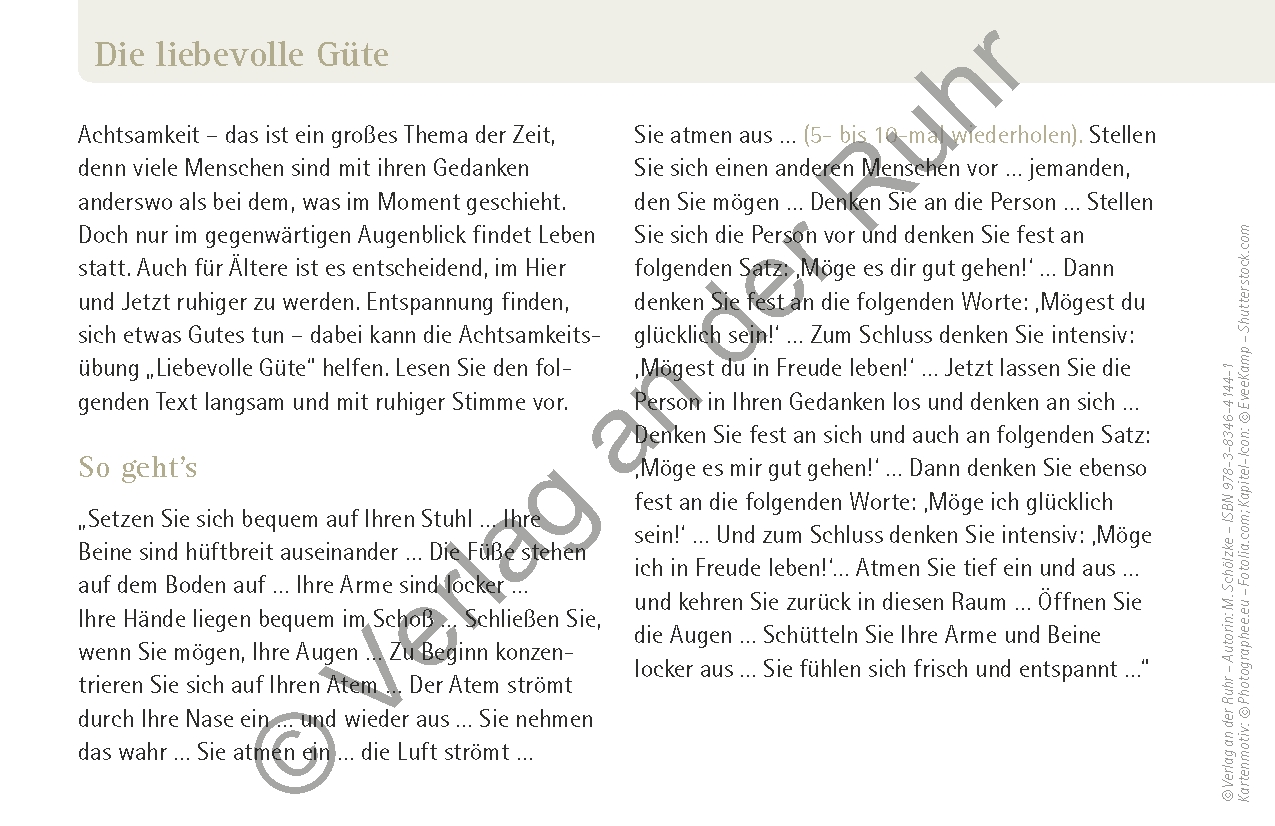 | Schlagworte | Altenpflege • Altersdemenz • Alzheimer • Alzheimerdemenz • Beauty für Senioren • Beauty - Nachmittag Senioren • Beauty-Tag Seniorenheim • Beschäftigung Senioren • Demenz • Demenzbetreuung • Entspannung Demenz • Entspannung Senioren • Ideen zur Pflege mit Wohlfühl-Charakter für Senior • Ideen zur Pflege mit Wohlfühl-Charakter für Senioren • Karten Wohlfühl-ideen für Senioren • Menschen mit Demenz • Pflege • Pflegealltag • Pflegedienste Ideen für Senioren • Pflegeheim Beschäftigung • Pflegende Angehörige • Professionelle Pflege Wohlfühl-Ideen für Senioren • Seniorenarbeit • Umgang mit Menschen mit Demenz • VadR Altenpflege • Verlag an der Ruhr Altenpflege • Wellnessangebote Seniorenheim • Wellness für Senioren • Wellness im Altenheim • Wellnessnachmittag Senioren • Wellness Seniorenheim • Wellness-Tag für Senioren • Wohlfühltag Senioren • Zeitmangel Pflege |