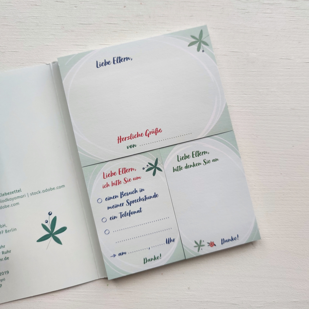 Organisationshilfe für Lehrer, für alle Schulformen und für alle Fächer, Klasse 1-13 +++ Sie müssten schnell noch Eltern an das mitzubringende Geld für die Klassenfahrt erinnern oder einfach kurz Danke sagen? Dann haben Sie mit dieser kleinen Sammlung an Haftnotizen immer eine passende Vorlage parat: einfach kurz beschriften oder ankreuzen, abziehen und aufkleben. Die "Klebchen" erleichtern Ihnen die Kommunikation mit den Eltern, wenn es um den Austausch kleiner Informationen oder Nachrichten geht. Die drei hübsch gestalteten Haftnotiz-Blöcke sind in einem A6-Heftchen gesammelt und damit schön geschützt vor Verknicken und Verschmutzen. So können Sie jederzeit ein geeignetes Klebezettelchen aus Schublade oder Tasche zaubern.