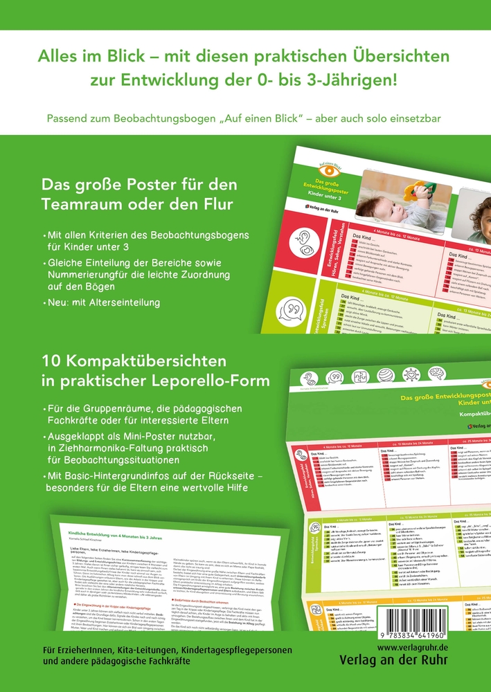 Entwicklungsübersicht für ErzieherInnen und Leitungen in Kitas und Krippen sowie Tageseltern +++ Diese übersichtlichen Entwicklungsposter sind die perfekte Ergänzung zum Beobachtungsbogen "Auf einen Blick": Alle Beobachtungskriterien entsprechen in Nummerierung und Farbgebung dem Buch und den Bögen der "Entwicklungsschnecke". Aufgeführt sind die Entwicklungsbereiche "Hören, Sehen, Verstehen", "Sprache", "Körperkontrolle", "Emotionalität, Soziales Miteinander" und "Denken". Das besondere Plus ist die Alterseinteilung nach Jahren. Auf diese Weise können Sie Fähigkeiten und Verhaltensweisen genauer einordnen - gleichzeitig lässt diese Einteilung genügend Spielräume, um individuelle Entwicklungsunterschiede zu berücksichtigen. Besonders praktisch sind die beiliegenden zehn Kompaktübersichten in Ziehharmonikafaltung. Diese Leporellos können Sie während der Beobachtung zu Rate ziehen, ausgeklappt an die Wand hängen oder auch als Überblick an interessierte Eltern herausgeben. Übrigens: Poster und Kompaktübersichten funktionieren auch ohne die Einführung des Beobachtungskonzepts "Auf einen Blick", das auf der "IPS-Methode"® der Autorin beruht. Ob Sie diese Entwicklungstabelle in Kita, Krippe oder Tagespflege einsetzen - die Entwicklung der Kinder haben Sie so immer im Blick.