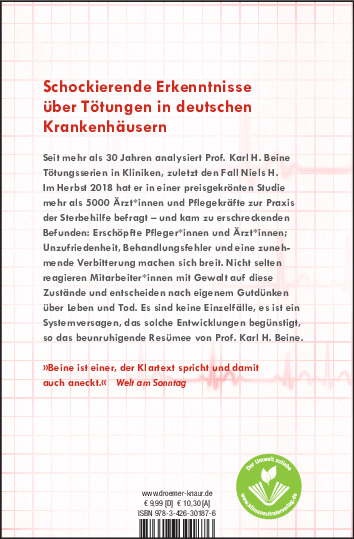 Professor em. Dr. med. Karl H. Beine, geboren 1951, war bis 2020 Lehrstuhlinhaber für Psychiatrie und Psychotherapie an der Universität Witten/Herdecke und Chefarzt am St. Marien-Hospital Hamm. Er forscht seit vielen Jahren zu Tötungsserien in Kliniken und Heimen. In der überarbeiteten Taschenbuchausgabe des Titels "Tatort Krankenhaus" untersucht er deutsche Fälle. In einer aktuellen Studie zum Dunkelfeld hat er mehr als 5000 Ärzte und Pflegekräfte in deutschen Krankenhäusern zu ihrer Praxis bei Lebensverkürzungen befragt.