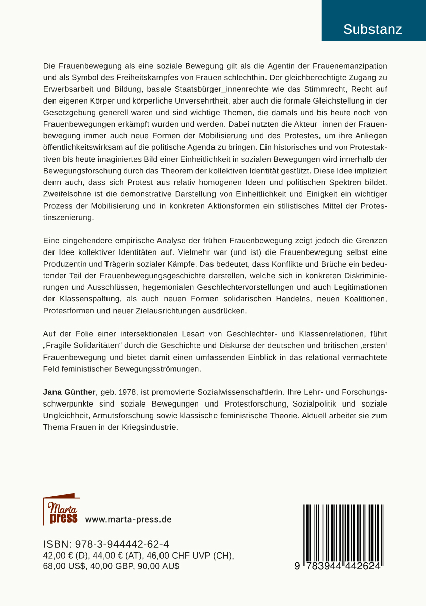 Die Frauenbewegung als eine soziale Bewegung gilt als die Agentin der Frauenemanzipation und als Symbol des Freiheitskampfes von Frauen schlechthin. Der gleichberechtigte Zugang zu Erwerbsarbeit und Bildung, basale Staatsbürger_innenrechte wie das Stimmrecht, Recht auf den eigenen Körper und körperliche Unversehrtheit, aber auch die formale Gleichstellung in der Gesetzgebung generell waren und sind wichtige Themen, die damals und bis heute noch von Frauenbewegungen erkämpft wurden und werden. Dabei nutzten die Akteur_innen der Frauenbewegung immer auch neue Formen der Mobilisierung und des Protestes, um ihre Anliegen öffentlichkeitswirksam auf die politische Agenda zu bringen. Ein historisches und von Protestaktiven bis heute imaginiertes Bild einer Einheitlichkeit in sozialen Bewegungen wird innerhalb der Bewegungsforschung durch das Theorem der kollektiven Identität gestützt. Diese Idee impliziert denn auch, dass sich Protest aus relativ homogenen Ideen und politischen Spektren bildet. Zweifelsohne ist die demonstrative Darstellung von Einheitlichkeit und Einigkeit ein wichtiger Prozess der Mobilisierung und in konkreten Aktionsformen ein stilistisches Mittel der Protestinszenierung.Eine eingehendere empirische Analyse der frühen Frauenbewegung zeigt jedoch die Grenzen der Idee kollektiver Identitäten auf. Vielmehr war (und ist) die Frauenbewegung selbst eine Produzentin und Trägerin sozialer Kämpfe. Das bedeutet, dass Konflikte und Brüche ein bedeutender Teil der Frauenbewegungsgeschichte darstellen, welche sich in konkreten Diskriminierungen und Ausschlüssen, hegemonialen Geschlechtervorstellungen und auch Legitimationen der Klassenspaltung, als auch neuen Formen solidarischen Handelns, neuen Koalitionen, Protestformen und neuer Zielausrichtungen ausdrücken.Auf der Folie einer intersektionalen Lesart von Geschlechter- und Klassenrelationen, führt "Fragile Solidaritäten" durch die Geschichte und Diskurse der deutschen und britischen 'ersten' Frauenbewegung und bietet damit einen umfassenden Einblick in das relational vermachtete Feld feministischer Bewegungsströmungen.