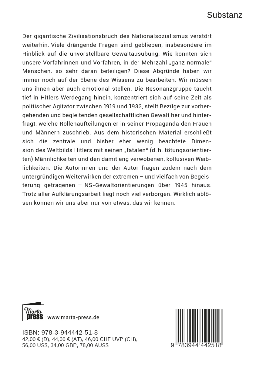 Die Resonanzgruppe taucht tief in Hitlers Werdegang hinein, konzentriert sich auf seine Zeit als politischer Agitator zwischen 1919 und 1933, stellt Bezüge zur vorhergehenden und begleitenden gesellschaftlichen Gewalt her und hinterfragt, welche Rollenaufteilungen er in seiner Propaganda den Frauen und Männern zuschrieb. Aus dem historischen Material erschließt sich die zentrale und bisher eher wenig beachtete Dimension des Weltbilds Hitlers mit seinen "fatalen" (d. h. tötungsorientierten) Männlichkeiten und den damit eng verwobenen, kollusiven Weiblichkeiten. Die Autorinnen und der Autor fragen zudem nach dem untergründigen Weiterwirken der extremen und vielfach von Begeisterung getragenen NS-Gewaltorientierungen über 1945 hinaus.