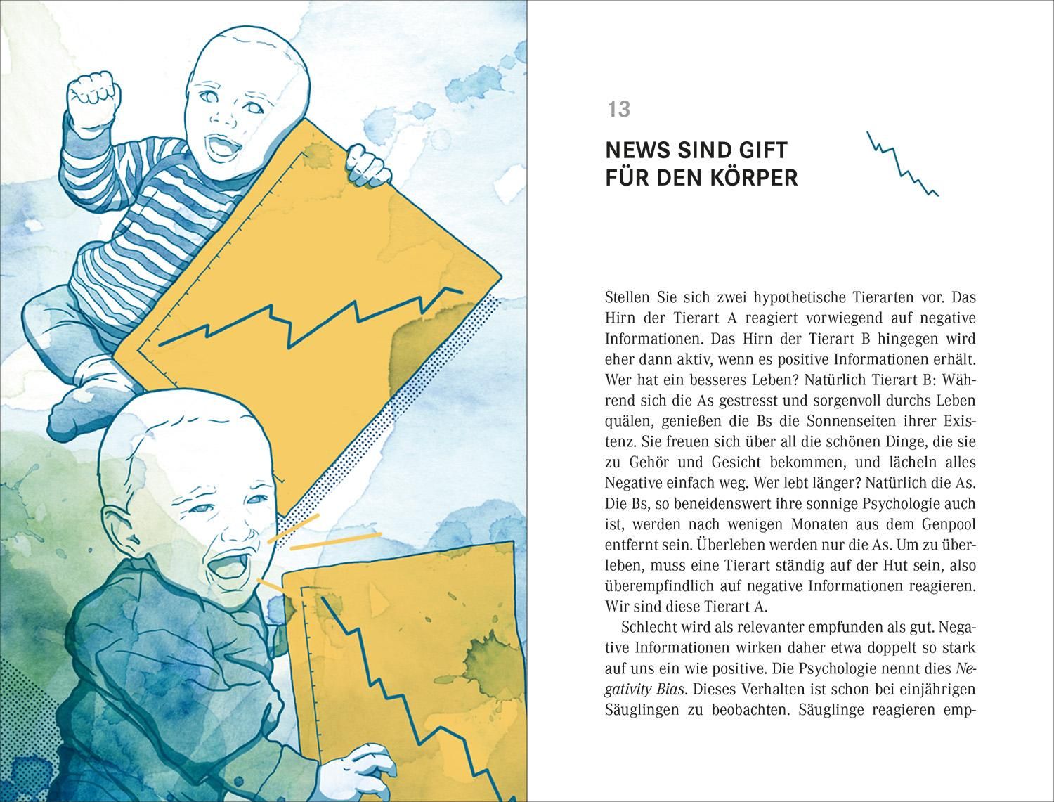 MAN HÄTTE EINE STECKNADEL FALLEN HÖREN KÖNNEN Am 12. April 2013 lud mich die Redaktion der englischen Zeitung The Guardian ein, die Übersetzung meines damals gerade erschienenen Buchs Die Kunst des klaren Denkens vorzustellen. Jede Woche darf ein Autor kurz sein neues Buch präsentieren, und in jener Woche wurde mir die Ehre zuteil. Chefredakteur Alan Rusbridger trommelte die Redaktion zusammen. Langsam füllte sich der Raum. Etwa fünfzig Journalisten standen da, Morgenkaffee in der Hand, tuschelten und warteten darauf, dass Rusbridger endlich erklären möge, wer dieser in England komplett unbekannte Mensch sei. Meine Frau hatte mich begleitet. Meine Hand umklammerte die ihre – ein Versuch, meine Nervosität in Schach zu halten. Hier waren die besten Köpfe einer weltweit führenden Zeitung versammelt, und ich hatte das einmalige Privileg, ein paar meiner Aperçus aus der Welt der Kognitionswissenschaft zum Besten zu geben – in der Hoffnung, dass einer von ihnen über mein Buch schreiben würde. Nach einem Räuspern hob Rusbridger an und sagte trocken: »Ich war gerade auf Ihrer Webseite und habe Ihren frechen Artikel entdeckt. Sprechen Sie darüber, nicht über Ihr neues Buch.« Darauf war ich nicht vorbereitet. Auf meiner Zunge lagen eingeübte, hoffentlich überzeugende, wohlformulierte Sätze zur Kunst des klaren Denkens, die idealerweise eins zu eins ihren Weg in den Guardian finden würden. Ich schluckte sie herunter. Der Artikel, den Rusbridger auf meiner Webseite entdeckt hatte, listete die wichtigsten Argumente gegen den Konsum von genau dem auf, was diese weltweit respektierten Profis Tag für Tag produzierten: News. Wohl oder übel legte ich los, tischte Grund um Grund auf, warum man auf das beliebteste Produkt einer ganzen Branche am besten verzichtet. Statt von zuvor fünfzig mir wohlgesinnten Menschen war ich jetzt von fünfzig Gegnern umzingelt. Ich versuchte, möglichst ruhig zu bleiben und das Kreuzfeuer ihrer Blicke auszuhalten. Nach zwanzig Minuten war ich mit meinen Argumenten am Ende und schloss mit dem Satz: »Seien wir ehrlich: Was Sie, meine Damen und Herren, hier betreiben, ist im Grunde Unterhaltung.« Stille. Man hätte eine Stecknadel fallen hören können. Rusbridger kniff die Augen zusammen, schaute sich um und sagte: »Ich möchte, dass wir Dobellis Argumente publizieren. Noch heute.« Er drehte sich um und verließ den Raum, ohne sich zu verabschieden. Die Journalisten folgten ihm. Keiner schaute mich an. Keiner wechselte auch nur ein Wort mit mir. Vier Stunden später stand eine Kurzversion meines Artikels auf der Guardian-Webseite. Innerhalb kürzester Zeit hatten sich 450 Leserkommentare angesammelt – das technische Maximum. Der Artikel »News is bad for you« wurde paradoxerweise zu einem der meistgelesenen Zeitungsartikel des Jahres. Das Büchlein, das Sie in den Händen halten, basiert auf eben diesem »frechen« Artikel. Aber es enthält noch viel mehr: mehr Gründe gegen den News-Konsum, mehr Forschung, was News mit uns anstellen, und mehr Tipps, wie wir die Sucht danach in den Griff bekommen und überwinden. Durch die Digitalisierung haben sich News von einem harmlosen Unterhaltungsmedium in eine Massenvernichtungswaffe gegen den gesunden Menschenverstand verwandelt. Dieser Gefahr gilt es, aus dem Weg zu gehen. Eins ist mir dabei sehr wichtig: Den News-Konsum einzuschränken bedeutet keinen bitteren Verzicht. Im Gegenteil: Sie werden reich beschenkt – mit viel Zeit und mit einem neuen Blick für das, was wirklich wesentlich ist und uns glücklich macht. Weil man Bücher gleich zweimal hintereinander lesen sollte, damit man nichts vergisst, habe ich es Ihnen für den zweiten Durchgang leicht gemacht: Lesen Sie die Take-aways. Viel Vergnügen bei der Lektüre! Rolf Dobelli, im April 2019 1 MEIN WEG ZUM NEWS-VERZICHT – TEIL 1 »Hallo, mein Name ist Rolf, und ich bin ein News-Junkie.« Gäbe es Selbsthilfegruppen für News-Süchtige, wie es sie zum Beispiel für Alkoholiker gibt, hätte ich mich mit diesem Satz in die Runde gesetzt und auf Verständnis gehofft. Das war vor über zehn Jahren. Angefangen hatte alles ganz normal. Hineingeboren in eine wunderbare Mittelklassefamilie, wuchs ich mit der üblichen News-Routine auf, die Ihnen bekannt vorkommen wird, wenn Sie ebenfalls in den 70er-Jahren jung waren. Jeden Werktag um 6:30 Uhr hörte ich, wie der Bote die Zeitung durch den Schlitz in den Briefkasten schob. Kurz darauf öffnete meine Mutter die Haustür einen Spalt weit und zupfte die Zeitung mit einer geschickten Handbewegung aus dem Kasten, ohne dass sie einen Schritt nach draußen machen musste. Auf dem Weg zur Küche trennte sie die Zeitung in zwei Teile, legte einen Teil meinem Vater hin (sie bestimmte, welchen) und behielt den anderen Teil bei sich. Während wir alle unser Frühstück genossen, blätterten unsere Eltern die Zeitung durch, tauschten dann die beiden Zeitungsteile, blätterten weiter. Um Punkt 7 Uhr lauschten wir alle den Nachrichten im Schweizer Radio DRS. Kurz darauf machte sich mein Vater zur Arbeit auf und wir Kinder zur Schule. Um 12 Uhr versammelte sich die ganze Familie um den Mittagstisch. Nach dem Mittagessen, um 12:30 Uhr, hatte man ruhig zu sein: Zeit für die Nachrichten im Radio. Dito am Abend, um 18:30 Uhr. Um 19:30 Uhr dann der Höhepunkt des Abends: die Tagesschau des Schweizer Fernsehens. News gehörten zu meinem Leben wie Ovomaltine zum Frühstück. Und doch hatte ich schon damals das Gefühl, dass irgendetwas nicht stimmte. Es erstaunte mich, dass die Zeitung jeden Tag gleich dick und gleich aufgebaut war. Die lokale Zeitung, die meine Eltern abonniert hatten (Luzerner Neuste Nachrichten), bestand aus einem Auslandsteil von einer Seite, einem Wirtschaftsteil von einer Seite, einem Stadt-Luzern-Teil von immer zwei Seiten und so weiter. Dabei spielte es keine Rolle, ob am Vortrag viel oder wenig passiert war. Es gab damals noch keine Sonntagszeitungen auf dem Schweizer Markt. Selbst die Montags