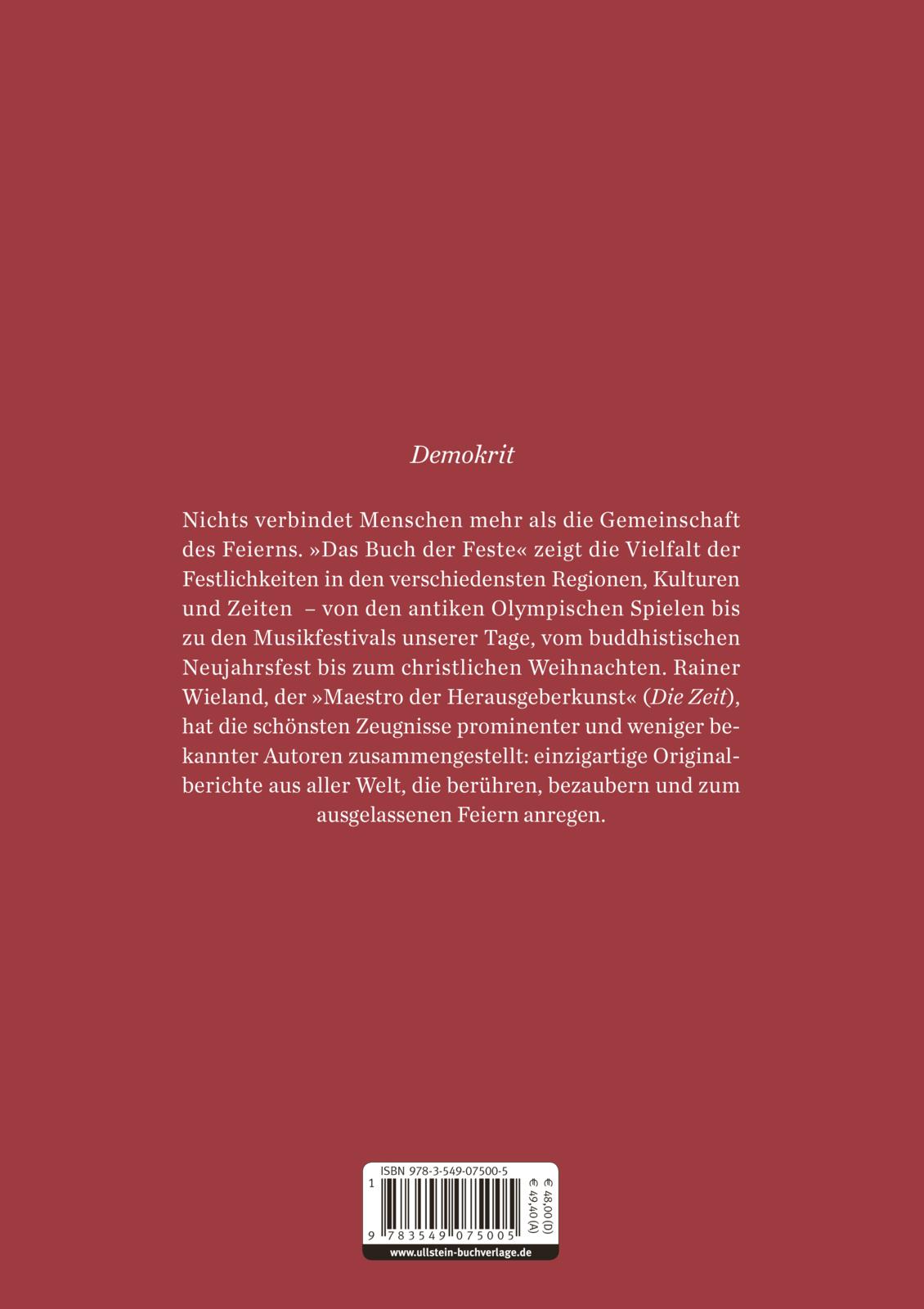 Nichts verbindet Menschen mehr als die Gemeinschaft des Feierns. "Das Buch der Feste" zeigt die Vielfalt der Festlichkeiten in den verschiedensten Regionen, Kulturen und Zeiten - von den antiken Olympischen Spielen bis zu den Musikfestivals unserer Tage, vom buddhistischen Neujahrsfest bis zum christlichen Weihnachtsfest. Seit ihren Anfängen feiern die Menschen Feste: um ihre Götter zu ehren, erfolgreiche Jagden und Ernten zu feiern, Fruchtbarkeit zu beschwören, bei Musik und Tanz die Gemeinschaft zu stärken oder ihren Herrschern zu huldigen. Feste gibt es in allen Kulturen der Welt, in ihnen manifestieren sich uralte Traditionen, Rituale und Gebräuche. Rainer Wieland, der "Maestro der Herausgeberkunst" (Die Zeit) hat die schönsten Zeugnisse prominenter und weniger bekannter Autoren zusammengestellt. Das Spektrum reicht von Platons Gastmahl bei Sokrates über den tanzenden Wiener Kongress bis zum Karneval in Rio. Einzigartige Originalberichte aus aller Welt, die berühren, bezaubern und zum ausgelassenen Feiern anregen.