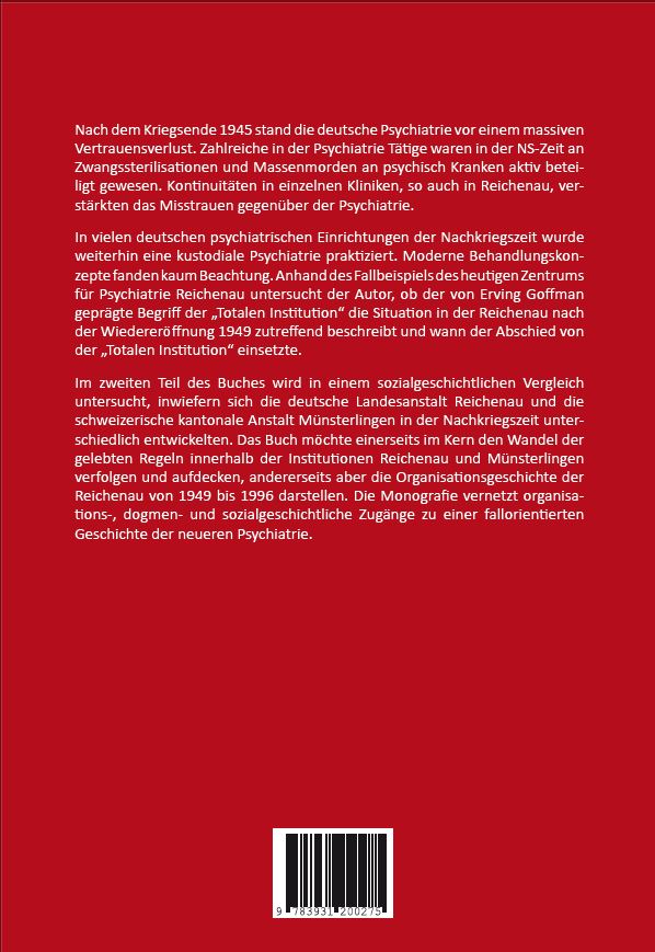 In vielen deutschen psychiatrischen Einrichtungen der Nachkriegszeit wurde weiterhin eine kustodiale Psychiatrie praktiziert. Moderne Behandlungskonzepte fanden kaum Beachtung. Anhand des Fallbeispiels des heutigen Zentrums für Psychiatrie Reichenau untersucht der Autor, ob der von Erving Goffman geprägte Begriff der „Totalen Institution“ die Situation in der Reichenau nach der Wiedereröffnung 1949 zutreffend beschreibt und wann der Abschied von der „Totalen Institution“ einsetzte. Im zweiten Teil des Buches wird in einem sozialgeschichtlichen Vergleich untersucht, inwiefern sich die deutsche Landesanstalt Reichenau und die schweizerische kantonale Anstalt Münsterlingen in der Nachkriegszeit unterschiedlich
