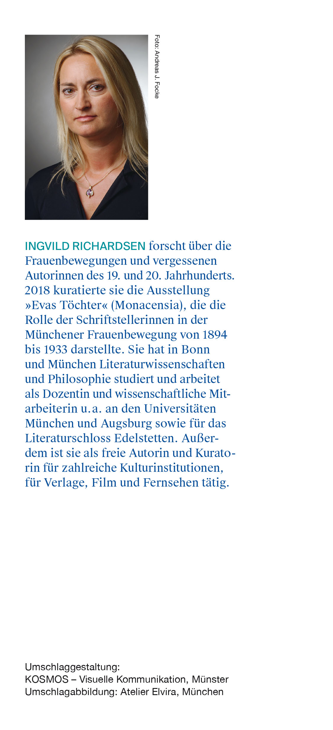 Ingvild Richardsen forscht über die Frauenbewegungen und vergessenen Autorinnen des 19. und 20. Jahrhunderts. 2018 kuratierte sie die Ausstellung »Evas Töchter« (Monacensia), die die Rolle der Schriftstellerinnen in der Münchener Frauenbewegung von 1894 bis 1933 darstellte. Sie hat in Bonn und München Literaturwissenschaften und Philosophie studiert und arbeitet als Dozentin und wissenschaftliche Mitarbeiterin u.a. an den Universitäten München und Augsburg sowie für das Literaturschloss Edelstetten. Außerdem ist sie als freie Autorin und Kuratorin für zahlreiche Kulturinstitutionen, für Verlage, Film und Fernsehen tätig.