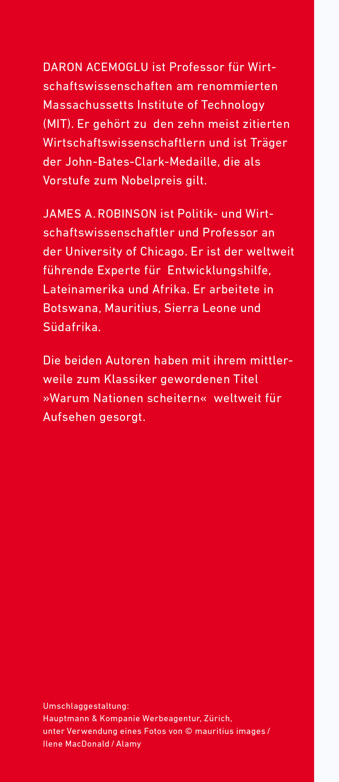 James A. Robinson ist Politik- und Wirtschaftswissenschaftler und Professor an der Harvard University. Er gilt als der weltweit führende Experte für Entwicklungshilfe in Lateinamerika und Afrika. Er arbeitete in Botswana, Mauritius, Sierra Leone und Südafrika.