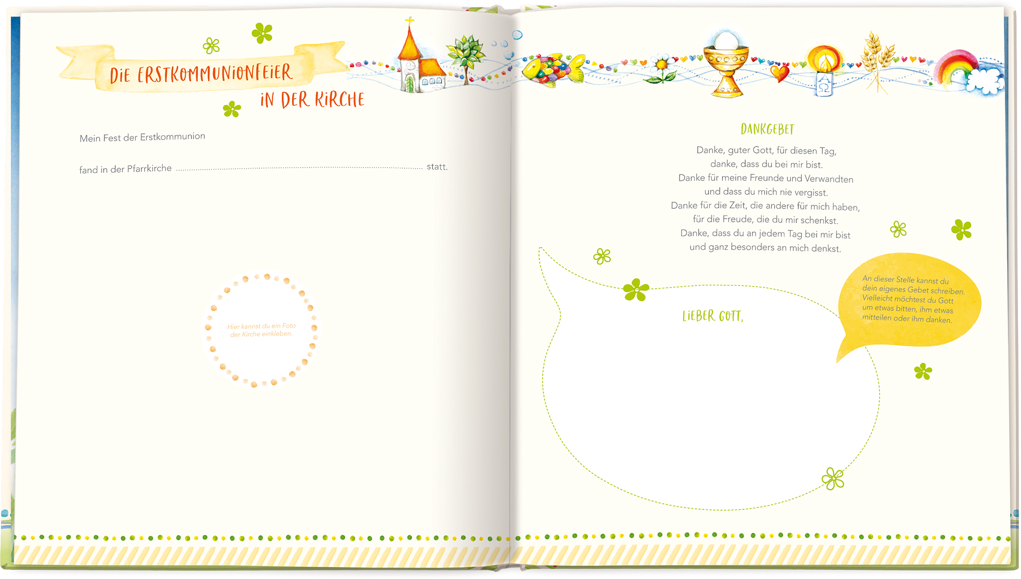 Neben Gebeten, Geschichten und Liedern bietet dieses wunderschön gestaltete Album viel Platz für Fotos, Eintragungen und Erinnerungen. Damit der Tag der ersten heiligen Kommunion noch lange im Gedächtnis bleibt. Ich wünsche dir,