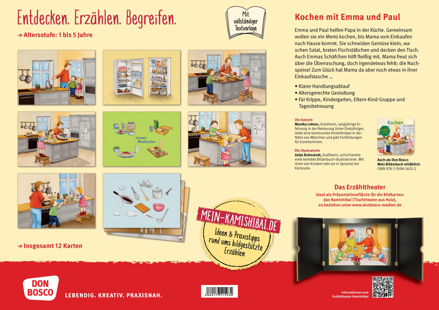 Emma und Paul wollen mit Emmas Papa ein Menü kochen, während Mama beim Einkaufen ist. Sie schneiden Gemüse klein, waschen Salat, braten Fischstäbchen und decken den Tisch. Mama freut sich über die Überraschung. Doch irgendetwas fehlt: die Nachspeise! Zum Glück hat Mama da aber noch etwas in ihrer Einkaufstasche ... Emma-und-Paul-Geschichten bringen typische Erlebnisse von Ein- bis Fünfjährigen auf die Bühne des Kamishibais. Für die Jüngsten lassen sich die Geschichten auch verkürzen und die älteren Kinder können schon von eigenen Erfahrungen berichten.