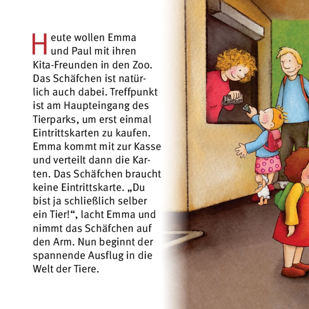 Emma und Paul machen einen Ausflug in den Zoo. Den Freunden fällt es gar nicht leicht zu entscheiden, was sie zuerst sehen möchten. Sie beobachten Affen, Pinguine, Seerobben und Antilopen. Die Elefanten dürfen sie sogar füttern. Da mopst die große Giraffe doch tatsächlich Pauls Käppi! Im Streichelzoo möchte Emmas Schäfchen am liebsten mit allen Tieren spielen ... In dieser Geschichte von Emma, Paul und dem Kuscheltier "Schäfchen" erkennen die Kinder eigene Erlebnisse, die sie im Laufe eines Jahres, mit den Eltern oder mit den Kindern ihrer Kita haben, wieder. Für Kinder von 1 bis 5 Jahren, mit klar angelegten Illustrationen der beliebten Bilderbuchillustratorin Antje Bohnstedt, einfachem Wortschatz und kurzen Sätzen.