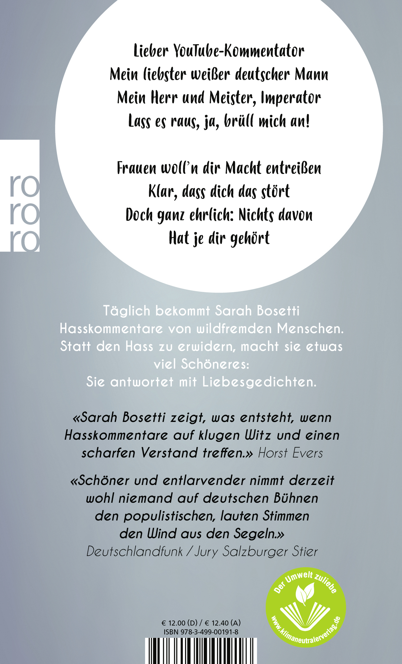 Als Frau, die sich am öffentlichen politischen Diskurs beteiligt, bekommt Sarah Bosetti fast täglich Hasskommentare im Internet. Doch die radioeins- und WDR2-Kolumnistin hasst nicht zurück, sondern nutzt den Hass als kreatives Rohmaterial und verwandelt ihn in seine schöne große Schwester: Liebe! In diesem Buch versammelt sie die schlimmsten Kommentare, macht aus ihnen pointierte, charmante Liebesgedichte – und setzt damit ein kluges, scharfzüngiges und sehr unterhaltsames Zeichen gegen den Hass in unserer Gesellschaft.