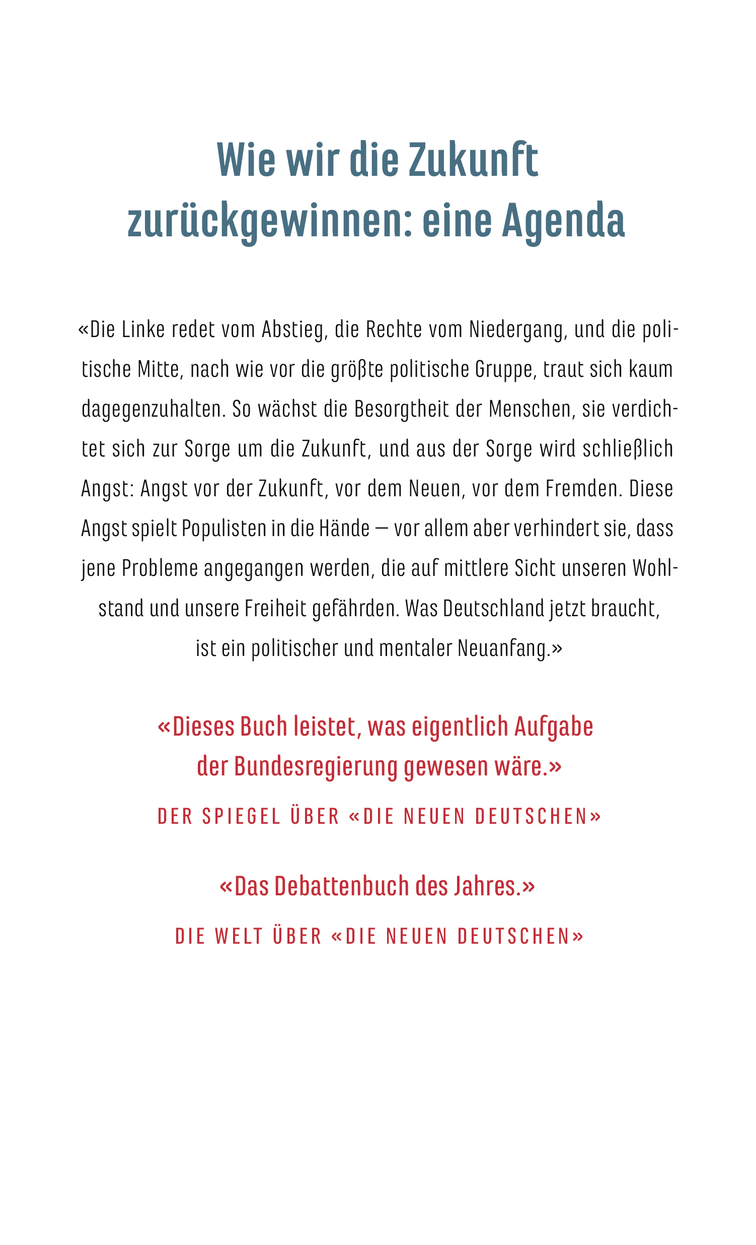 «Dieses Buch leistet, was eigentlich Aufgabe der Bundesregierung gewesen wäre», schrieb der «Spiegel» über das Vorgängerbuch «Die neuen Deutschen» - und das gilt genauso für dieses: Es bekämpft falsche, gefährliche Ängste und zeigt, was Deutschland jetzt braucht und wie wir die Zukunft zurückgewinnen können.