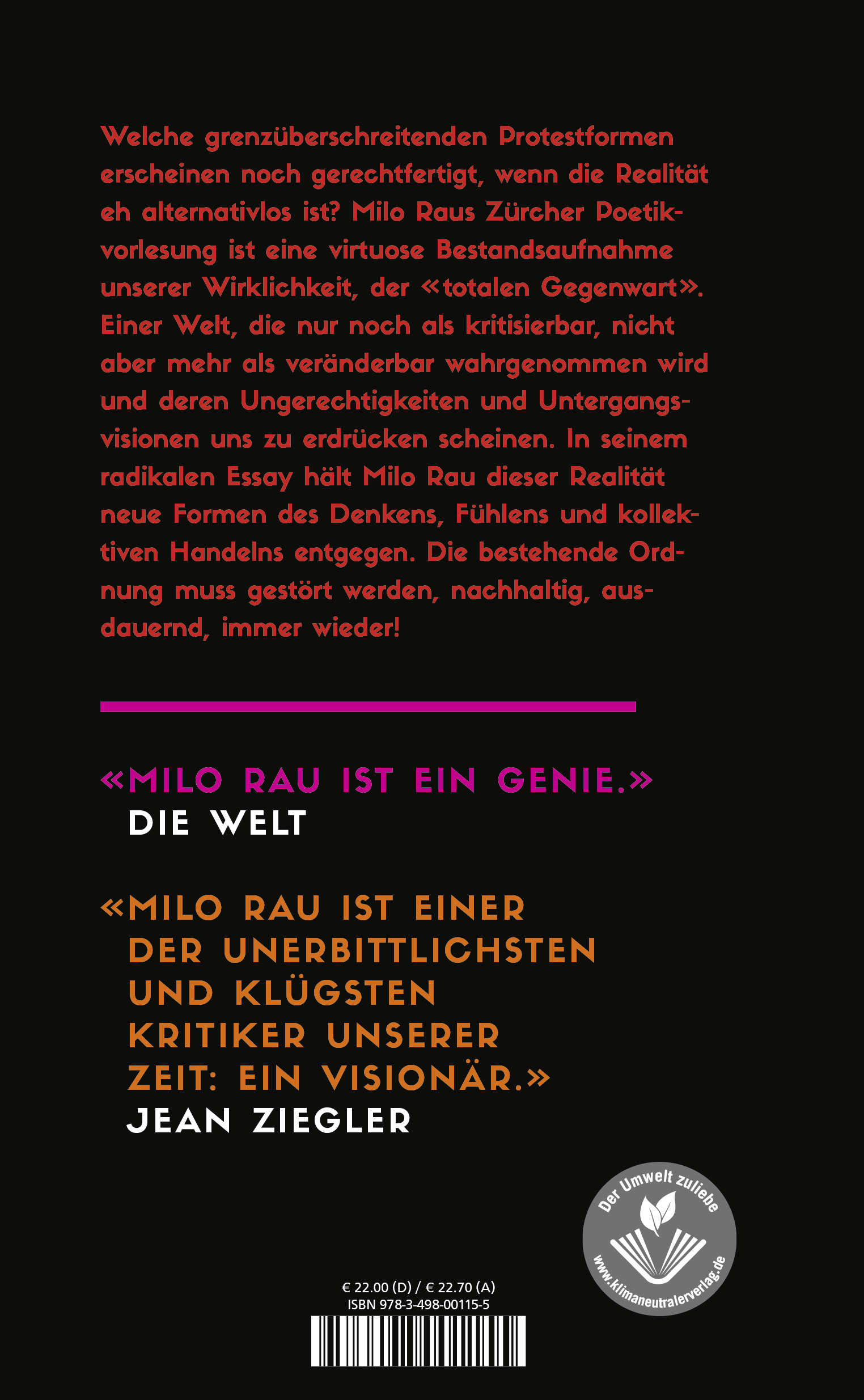 In unserem Zeitalter der »totalen Gegenwart« wird die Welt nur noch als kritisierbar, nicht aber mehr als veränderbar wahrgenommen. Welche grenzüberschreitenden Protestformen erscheinen noch gerechtfertigt, wenn die Realität eh alternativlos ist? Wie wir gegen die gefühlte Untergangsstimmung angehen können, zeigt Milo Rau in seinem neuen Buch.
