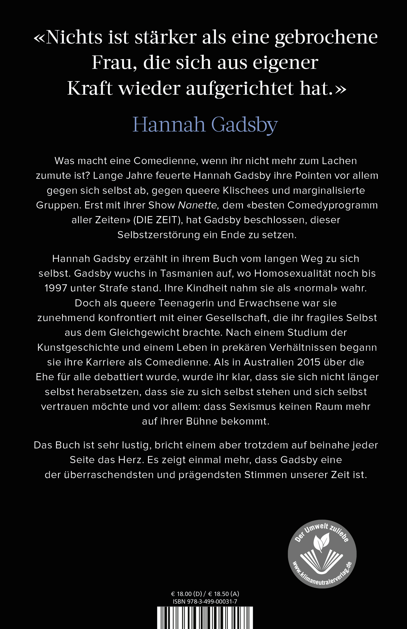 Die australische Komikerin Hannah Gadsby ist eine Sensation. Auf Netflix war ihre Show ein riesiger Erfolg, die ZEIT sprach vom «besten Comedyprogramm aller Zeiten». Gadsby wuchs in Tasmanien auf, wo Homosexualität noch bis 1997 unter Strafe stand. In ihrem Buch erzählt sie, wie sie sich in einem schmerzhaften Prozess ihren Traumata gestellt hat, um schließlich Frieden mit sich zu schließen, nicht aber mit der Gesellschaft. Sie rechnet ab mit den frauenfeindlichen Traditionen in Kunst, Gesellschaft und Politik. Hannah Gadsby berührt und bewegt nachhaltig. Ihr Buch ist klug, humorvoll, stimmt nachdenklich und ist lebensverändernd.