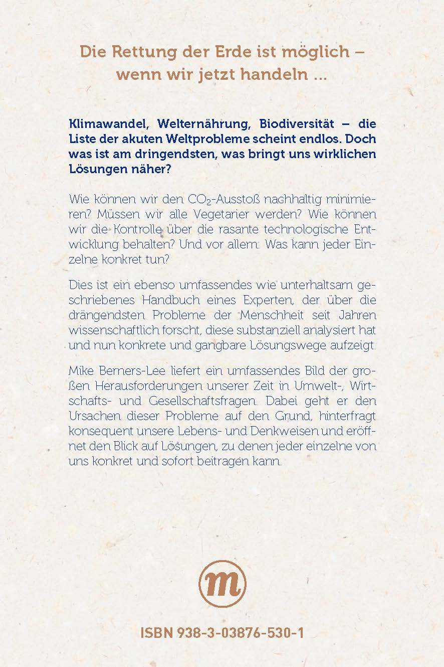 »Mike Berners-Lee predigt nicht, sondern teilt seine profunden Einsichten mit Witz und Wärme. Sein Buch passt ausgezeichnet in diese Zeit.« BBC »Eine lebendige und überzeugende Einschätzung dessen, was mit der Biosphäre und den Ressourcen unserer Erde geschieht ...« Astronomer Royal "Eine Stärke des Buches ist die Verbindung von komplexen Szenarien mit konkreter Handlungsoption auf verschiedenen Ebenen... Es erläutert nicht nur, welche Gefahren drohen, sondern auch, warum nachhaltige Lebensstile befriedigender und gesünder wären. Der Autor verspricht Freude und Zufriedenheit, nicht armselige Austerität." D+C "Mike Berners-Lee hat ein optimistisches Buch geschrieben, ein Buch, das auf Veränderungen zum Besseren setzt. "Wir müssen mit dem Gejammer aufhören. Und wir müssen endlich mal die Vorteile des Wandels sehen. Wir können nicht mehr über die Zukunft reden wie in der Vergangenheit. Wirtschaftliches Wachstum ist nicht die Lösung. Sie vermüllt die Erde und sie zerstört alles, was darauf lebt. Und am Ende auch uns." Das Erste, ttt