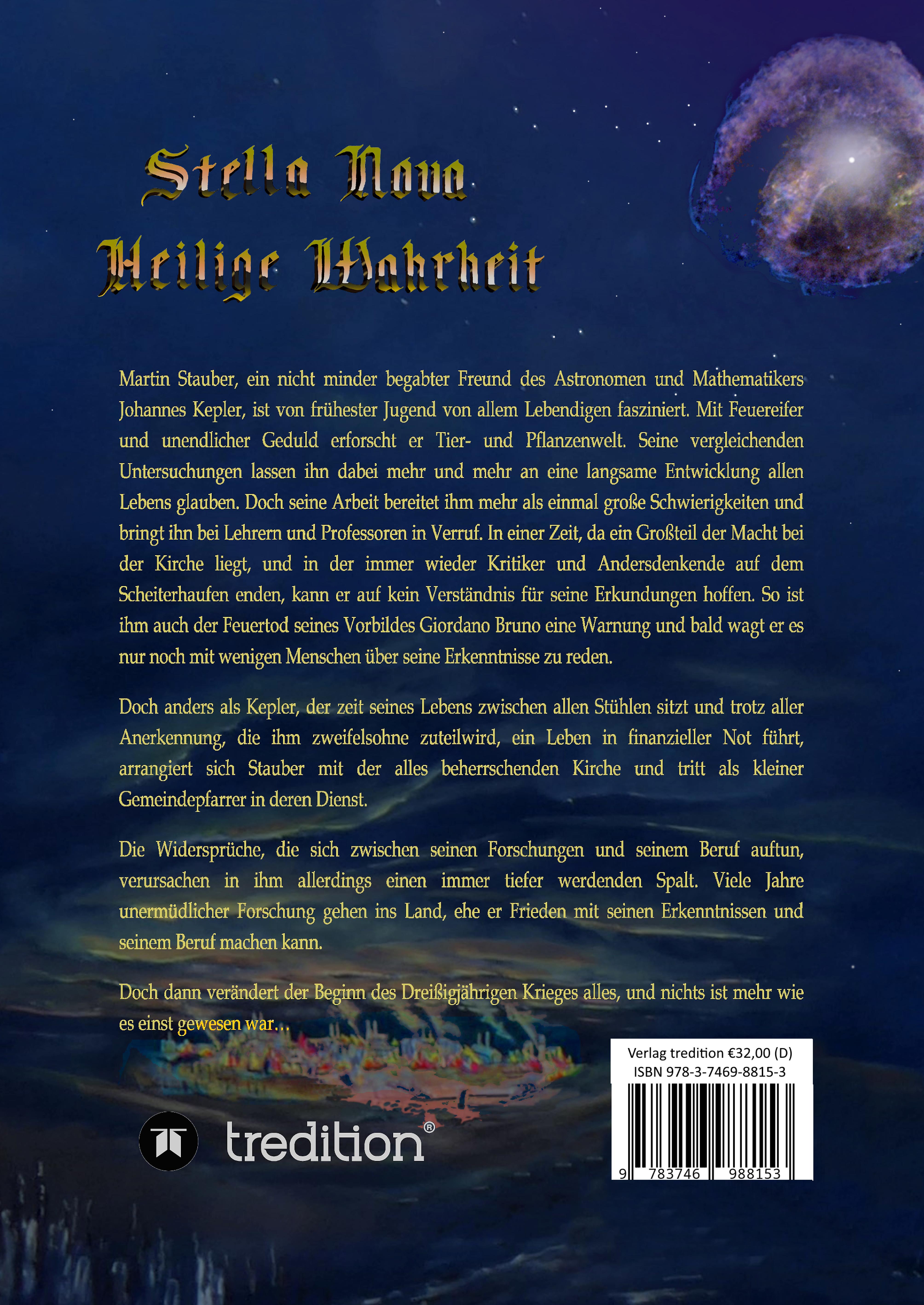 Martin Stauber, ein nicht minder begabter Freund des Astronomen und Mathematikers Johannes Kepler, ist von frühester Jugend von allem Lebendigen fasziniert. Mit Feuereifer und unendlicher Geduld erforscht er Tier- und Pflanzenwelt. Seine vergleichenden Untersuchungen lassen ihn dabei mehr und mehr an eine langsame Entwicklung allen Lebens glauben. Doch seine Arbeit bereitet ihm mehr als einmal große Schwierigkeiten und bringt ihn bei Lehrern und Professoren in Verruf. In einer Zeit, da ein Großteil der Macht bei der Kirche liegt, und in der immer wieder Kritiker und Andersdenkende auf dem Scheiterhaufen enden, kann er auf kein Verständnis für seine Erkundungen hoffen. So ist ihm auch der Feuertod seines Vorbildes Giordano Bruno eine Warnung und bald wagt er es nur noch mit wenigen Menschen über seine Erkenntnisse zu reden. Doch anders als Kepler, der zeit seines Lebens zwischen allen Stühlen sitzt und trotz aller Anerkennung, die ihm zweifelsohne zuteilwird, ein Leben in finanzieller Not führt, arrangiert sich Stauber mit der alles beherrschenden Kirche und tritt als kleiner Gemeindepfarrer in deren Dienst.Die Widersprüche, die sich zwischen seinen Forschungen und seinem Beruf auftun, verursachen in ihm allerdings einen immer tiefer werdenden Spalt. Viele Jahre unermüdlicher Forschung gehen ins Land, ehe er Frieden mit seinen Erkenntnissen und seinem Beruf machen kann. Doch dann verändert der Beginn des Dreißigjährigen Krieges alles, und nichts ist mehr wie es einst gewesen war...