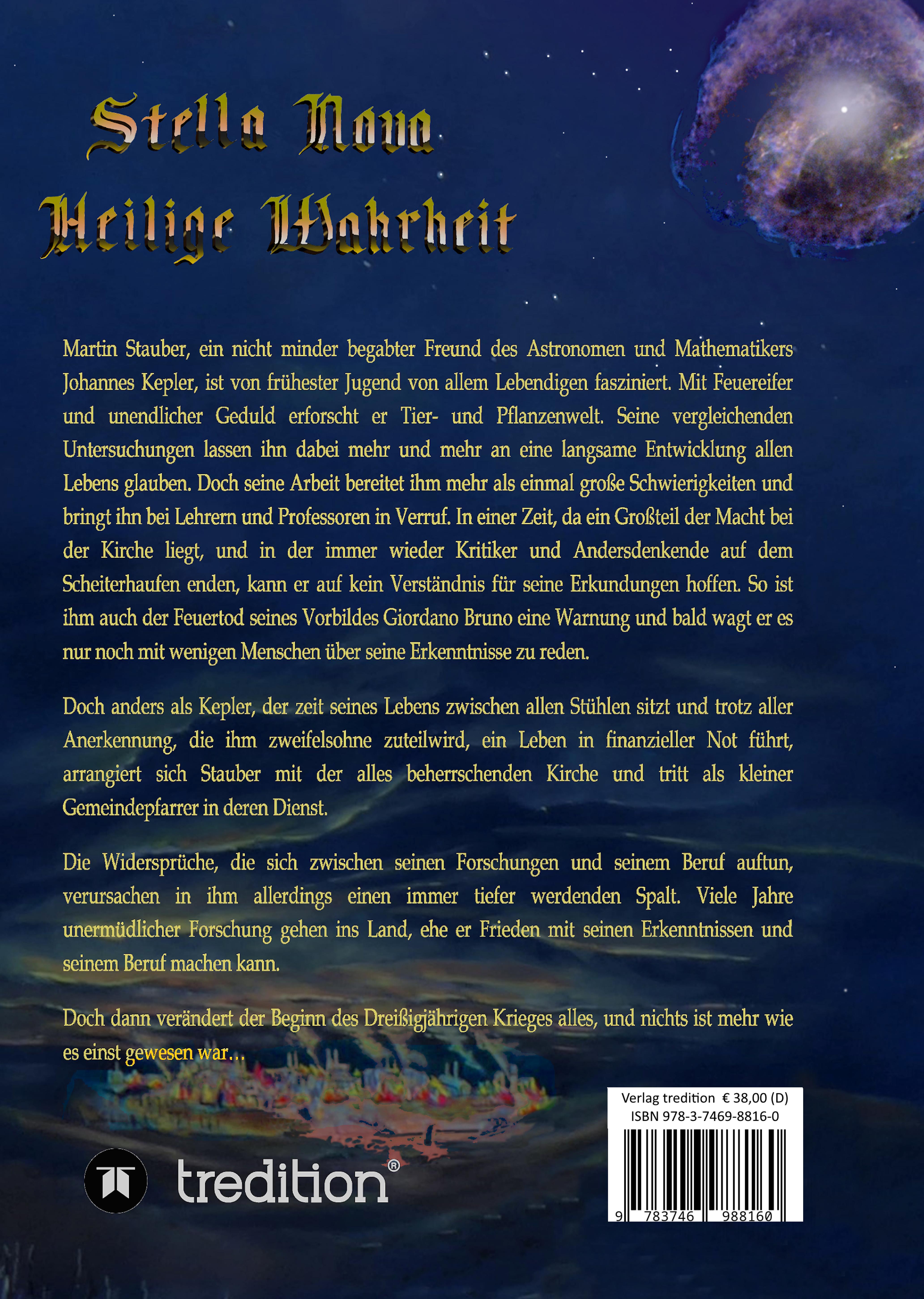 Martin Stauber, ein nicht minder begabter Freund des Astronomen und Mathematikers Johannes Kepler, ist von frühester Jugend von allem Lebendigen fasziniert. Mit Feuereifer und unendlicher Geduld erforscht er Tier- und Pflanzenwelt. Seine vergleichenden Untersuchungen lassen ihn dabei mehr und mehr an eine langsame Entwicklung allen Lebens glauben. Doch seine Arbeit bereitet ihm mehr als einmal große Schwierigkeiten und bringt ihn bei Lehrern und Professoren in Verruf. In einer Zeit, da ein Großteil der Macht bei der Kirche liegt, und in der immer wieder Kritiker und Andersdenkende auf dem Scheiterhaufen enden, kann er auf kein Verständnis für seine Erkundungen hoffen. So ist ihm auch der Feuertod seines Vorbildes Giordano Bruno eine Warnung und bald wagt er es nur noch mit wenigen Menschen über seine Erkenntnisse zu reden. Doch anders als Kepler, der zeit seines Lebens zwischen allen Stühlen sitzt und trotz aller Anerkennung, die ihm zweifelsohne zuteilwird, ein Leben in finanzieller Not führt, arrangiert sich Stauber mit der alles beherrschenden Kirche und tritt als kleiner Gemeindepfarrer in deren Dienst.Die Widersprüche, die sich zwischen seinen Forschungen und seinem Beruf auftun, verursachen in ihm allerdings einen immer tiefer werdenden Spalt. Viele Jahre unermüdlicher Forschung gehen ins Land, ehe er Frieden mit seinen Erkenntnissen und seinem Beruf machen kann. Doch dann verändert der Beginn des Dreißigjährigen Krieges alles, und nichts ist mehr wie es einst gewesen war...
