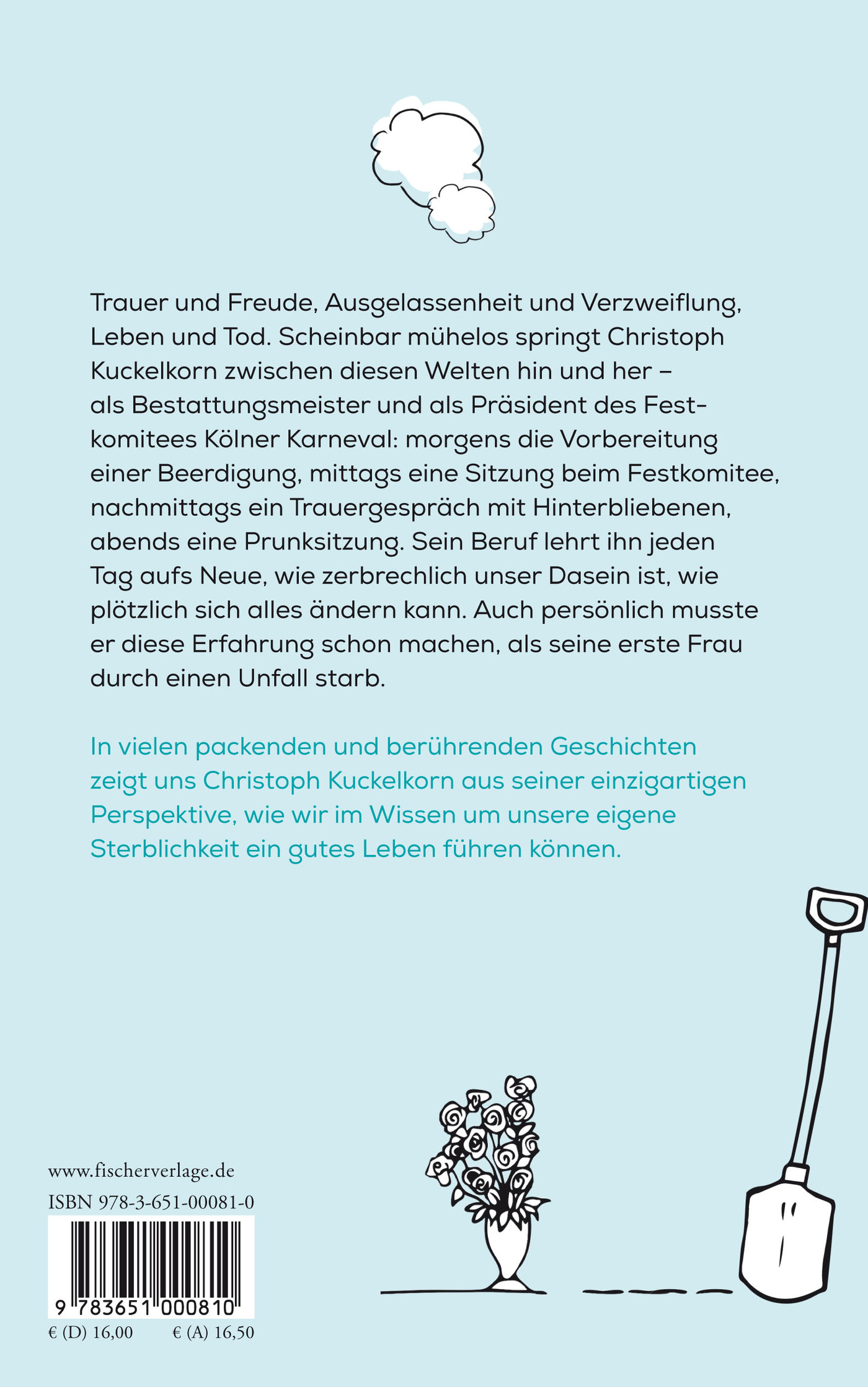 Tod und Leben – zwischen beiden Welten bewegt sich Christoph Kuckelkorn mühelos, manchmal innerhalb nur weniger Stunden: morgens die Vorbereitung einer Beerdigung, mittags eine Sitzung beim Festkomitee, nachmittags ein Trauergespräch mit Hinterbliebenen, abends eine Prunksitzung. Sein Beruf lehrt ihn jeden Tag aufs Neue, wie zerbrechlich unser Dasein ist, wie plötzlich sich alles ändern kann. Und danach Totenwache. Die Gleichzeitigkeit der Gefühle ist für ihn keine Theorie, sondern tägliche Praxis, die ihn viel über das Leben gelehrt hat. Er propagiert das Leben im Hier und Jetzt. Und praktiziert es.