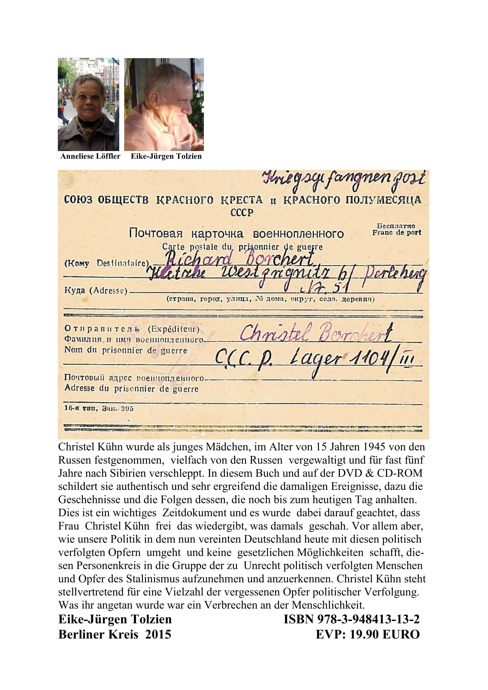 Christel Kühn, geb. Borchert, in Teichwalde bei Crossen, Mark Brandenburg. Sie besuchte die dortige Schule. Mit 15 Jahren wurde sie von den Russen nach vielfach vergewaltigt, kam vor ein Militärtribunal, wurde 1945, weil sie Deutsche war, zu fünf Jahren Zwangsarbeit verurteilt und dann nach Sibirien verschleppt. Dort musste sie von 1945 bis 1949 schwere Zwangsarbeit unter Einsatz ihres Lebens ableisten-immer dabei den Tod vor den Augen. Über diese schwere und schlimme Zeit berichtet sie in diesem Buch. In ihre Heimat konnte sie nicht wieder zurück. So landete sie nach der Rückkehr aus der Gefangenschaft in Gronenfelde und danach in Kletzke. Dort heiratete sie, arbeitete in der Landwirtschaft und bekam zwei Söhne. Später zog sie nach Bad Wilsnack und arbeitete dort in einer Möbelfabrik. Am 03.12.2019 ist sie verstorben. Dieses Buch aber erinnert weiter an sie.