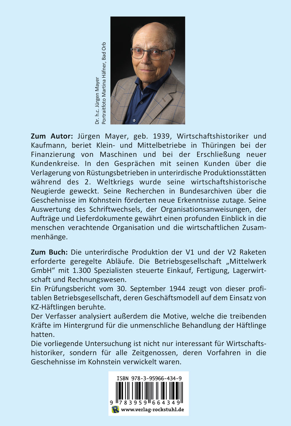 Zum Autor: Jürgen Mayer, geb. 1939, Wirtschaftshistoriker und Kaufmann, beriet Klein- und Mittelbetriebe in Thüringen bei der Finanzierung von Maschinen und bei der Erschließung neuer Kundenkreise. In den Gesprächen mit seinen Kunden über die Verlagerung von Rüstungsbetrieben in unterirdische Produktionsstätten während des 2. Weltkriegs wurde seine wirtschaftshistorische Neugierde geweckt. Seine Recherchen in Bundesarchiven über die Geschehnisse im Kohnstein förderten neue Erkenntnisse zutage. Seine Auswertung des Schriftwechsels, der Organisationsanweisungen, der Aufträge und Lieferdokumente gewährt einen profunden Einblick in die menschen verachtende Organisation und die wirtschaftlichen Zusammenhänge.