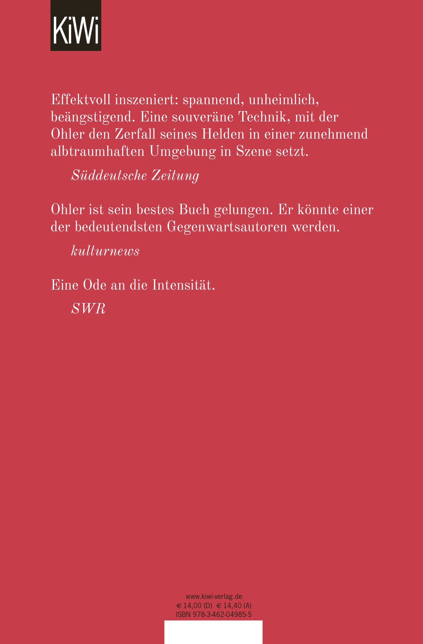 Norman Ohler, 1970 geboren, ist der Autor von vier von der Presse gefeierten Romanen und zwei Sachbüchern. Sein erster Roman »Die Quotenmaschine« erschien 1995 zunächst als Hypertext im Netz und gilt als weltweit erster Internet-Roman. »Mitte« (2001) und »Stadt des Goldes« (2002) komplettieren seine Metropolentriologie. 2015 erschien »Der totale Rausch« über die kaum aufgearbeitete Rolle von Drogen im Dritten Reich. Es wurde in mehr als 30 Sprachen übersetzt und stand auf der Bestsellerliste der New York Times. Paramount hat eine Option auf die Filmrechte erworben. 2017 erschien Ohlers historischer Kriminalroman »Die Gleichung des Lebens«, der mit lebendigem Zeitkolorit das 18. Jahrhundert wiederauferstehen lässt.