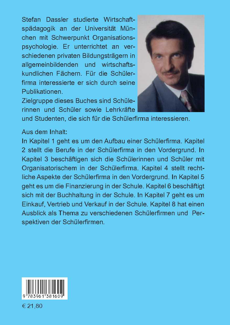 Stefan Dassler studierte Wirtschaftspädagogik an der Universität München mit Schwerpunkt Organisationspsychologie. Er unterrichtet an verschiedenen privaten Bildungsträgern in allgemeinbildenden und wirtschaftskundlichen Fächern. Für die Schülerfirma interessierte er sich durch seine Publikationen.