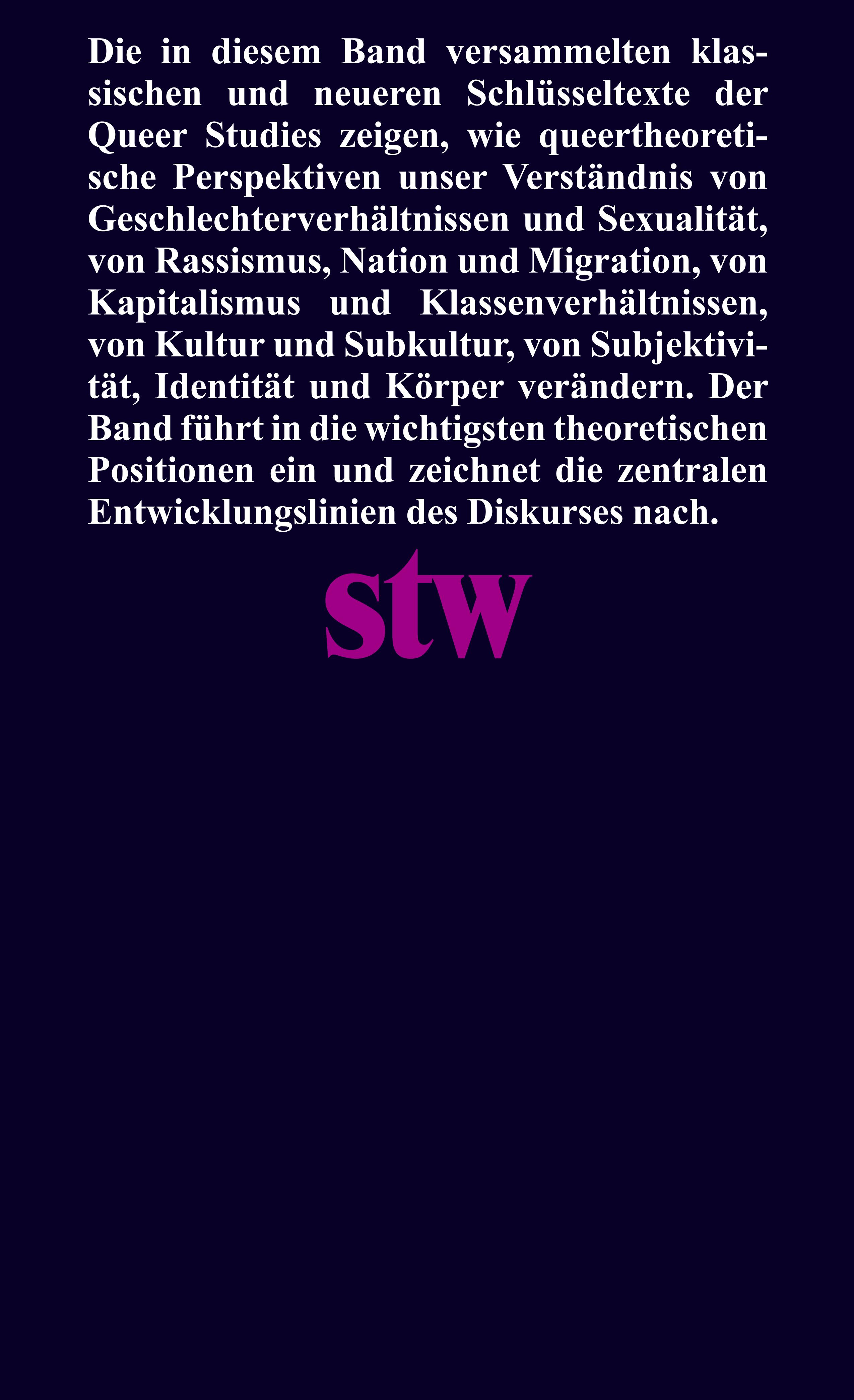 Dieser Band versammelt klassische und neuere Schlüsseltexte der anglophonen Queer Studies in deutscher Sprache, von Judith Butler und Eve Kosofsky Sedgwick bis Cathy Cohen und José Esteban Muñoz. Er führt in die wichtigsten theoretischen Positionen ein, macht mit den zentralen Entwicklungslinien des Diskurses vertraut und präsentiert wegweisende queere Analysen zu Kapitalismus, Migration, Geopolitik, Behinderung, Aktivismus, Kultur und Subkultur.