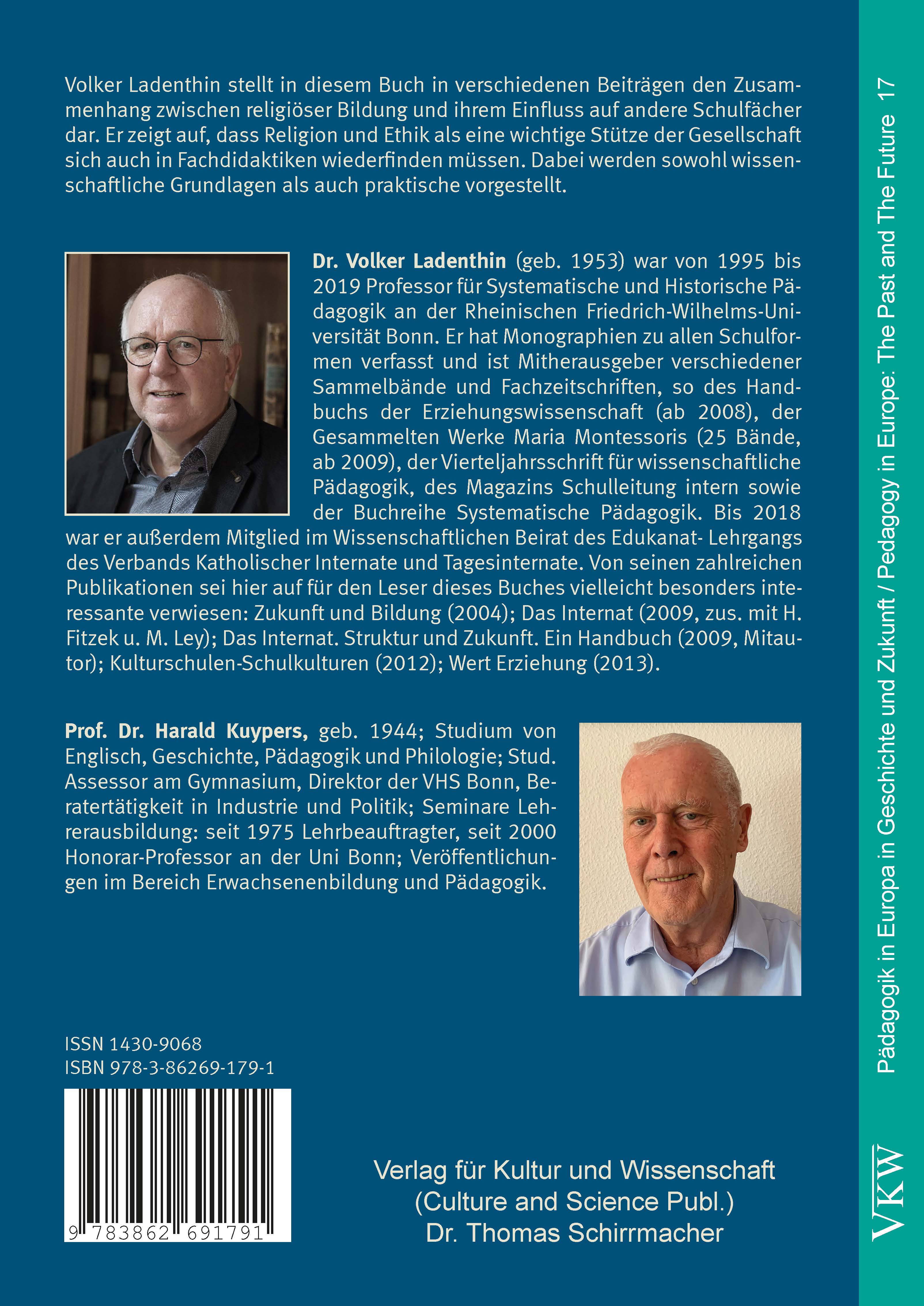 Dr. Volker Ladenthin (geb.1953) war von 1995 bis 2019 Professor für Systematische und Historische Pädagogik an der Rheinischen Friedrich-Wilhelms-Universität Bonn. Er hat Monographien zu allen Schulformen verfasst und ist Mitherausgeber verschiedener Sammelbände und Fachzeitschriften, so des Handbuchs der Erziehungswissenschaft (ab 2008), der Gesammelten Werke Maria Montessoris (25 Bände, ab 2009), der Vierteljahrsschrift für wissenschaftliche Pädagogik, des Magazins Schulleitung intern sowie der Buchreihe Systematische Pädagogik. Bis 2018 war er außerdem Mitglied im Wissenschaftlichen Beirat des Edukanat-Lehrgangs des Verbands Katholischer Internate und Tagesinternate. Von seinen zahlreichen Publikationen sei hier auf für den Leser dieses Buches vielleicht besonders interessante verwiesen: Zukunft und Bildung (2004); Das Internat (2009, zus. mit H. Fitzek u. M. Ley); Das Internat. Struktur und Zukunft. Ein Handbuch (2009, Mitautor); Kulturschulen-Schulkulturen (2012); Wert Erziehung (2013).