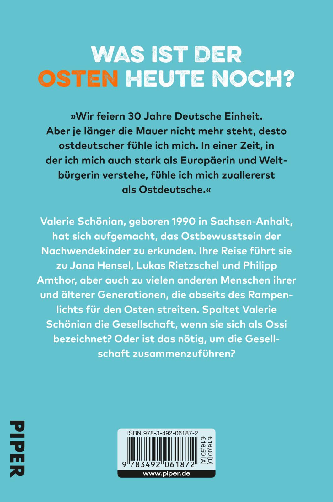 Valerie Schönian kam Ende September 1990 in Sachsen-Anhalt zur Welt — wenige Tage vor der Wiedervereinigung. Sie wurde geboren in einem Staat, der kurz darauf nicht mehr existierte. Lange dachte sie, Ost und West spielen keine Rolle mehr. 2020 feiert Deutschland 30 Jahre Wiedervereinigung, doch je länger die Mauer gefallen ist, desto ostdeutscher fühlt sich Valerie Schönian. Und damit ist sie nicht allein. Woher kommt das neue Ost-Bewusstsein, warum halten sich alte Klischees so hartnäckig, und was sagt das über die Deutsche Einheit aus? Um Antworten zu finden, sprach Valerie Schönian mit Soziologen, Politikern und Vertretern ihrer und älterer Generationen aus West und Ost, darunter Lukas Rietzschel, Jana Hensel und Philipp Amthor.