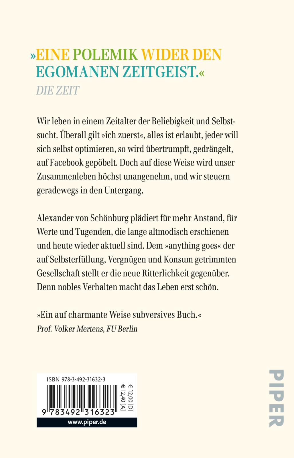 Alexander von Schönburg plädiert für mehr Anstand, für Werte und Tugenden, die lange altmodisch erschienen und heute wieder aktuell sind. Dem »anything goes« der auf Selbsterfüllung, Vergnügen und Konsum getrimmten Gesellschaft stellt er die neue Ritterlichkeit gegenüber. Denn nobles Verhalten macht das Leben erst schön.