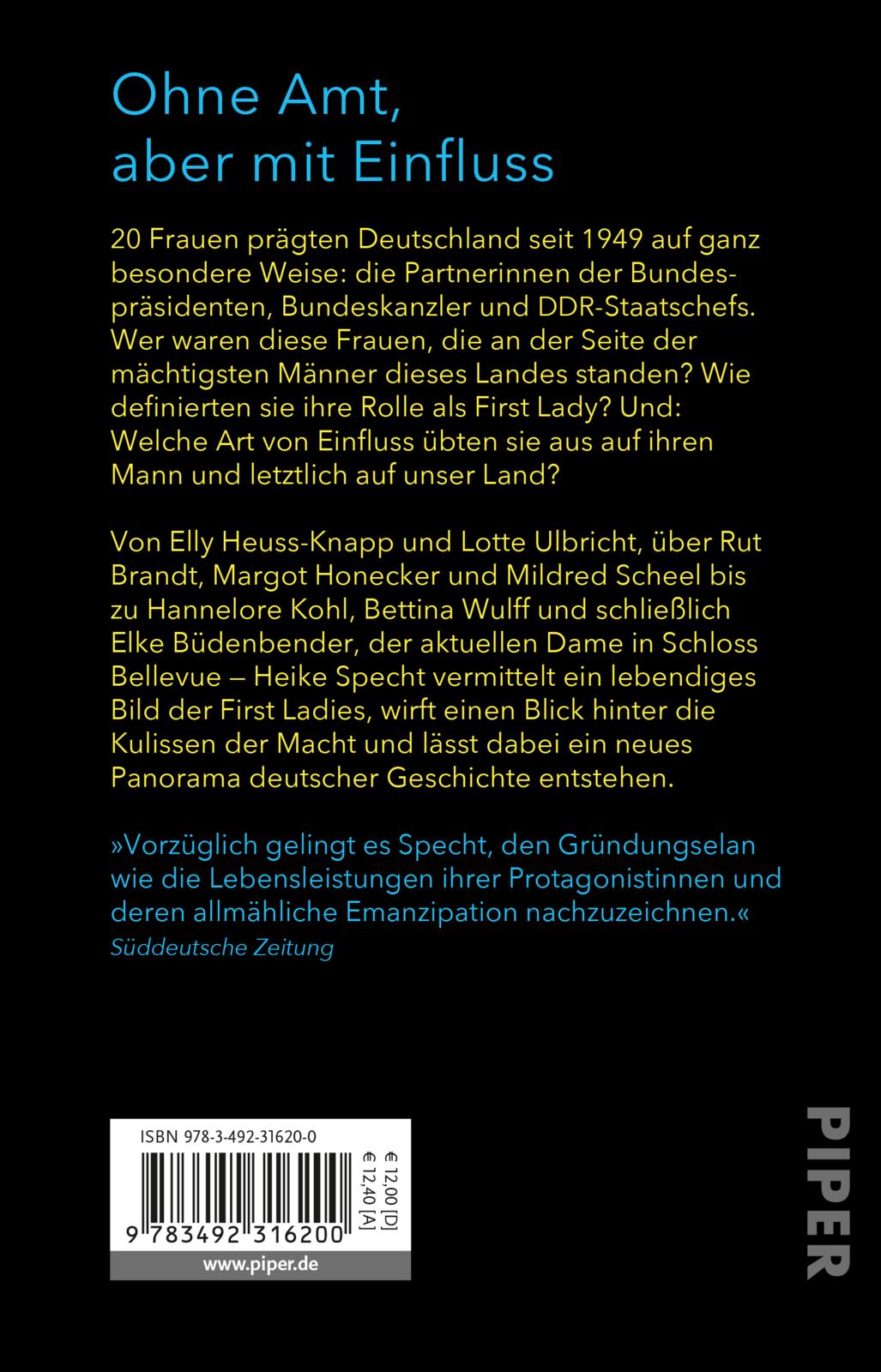 Heike Specht hat zahlreiche Interviews mit den First Ladies, ihren Nachfahren und Weggefährten geführt und akribisch recherchiert. Sie lässt uns hinter die Kulissen der Staatsführung blicken und entwirft ein faszinierendes Panorama deutscher Geschichte. Und natürlich geht es auch um den ersten First Husband: Joachim Sauer.