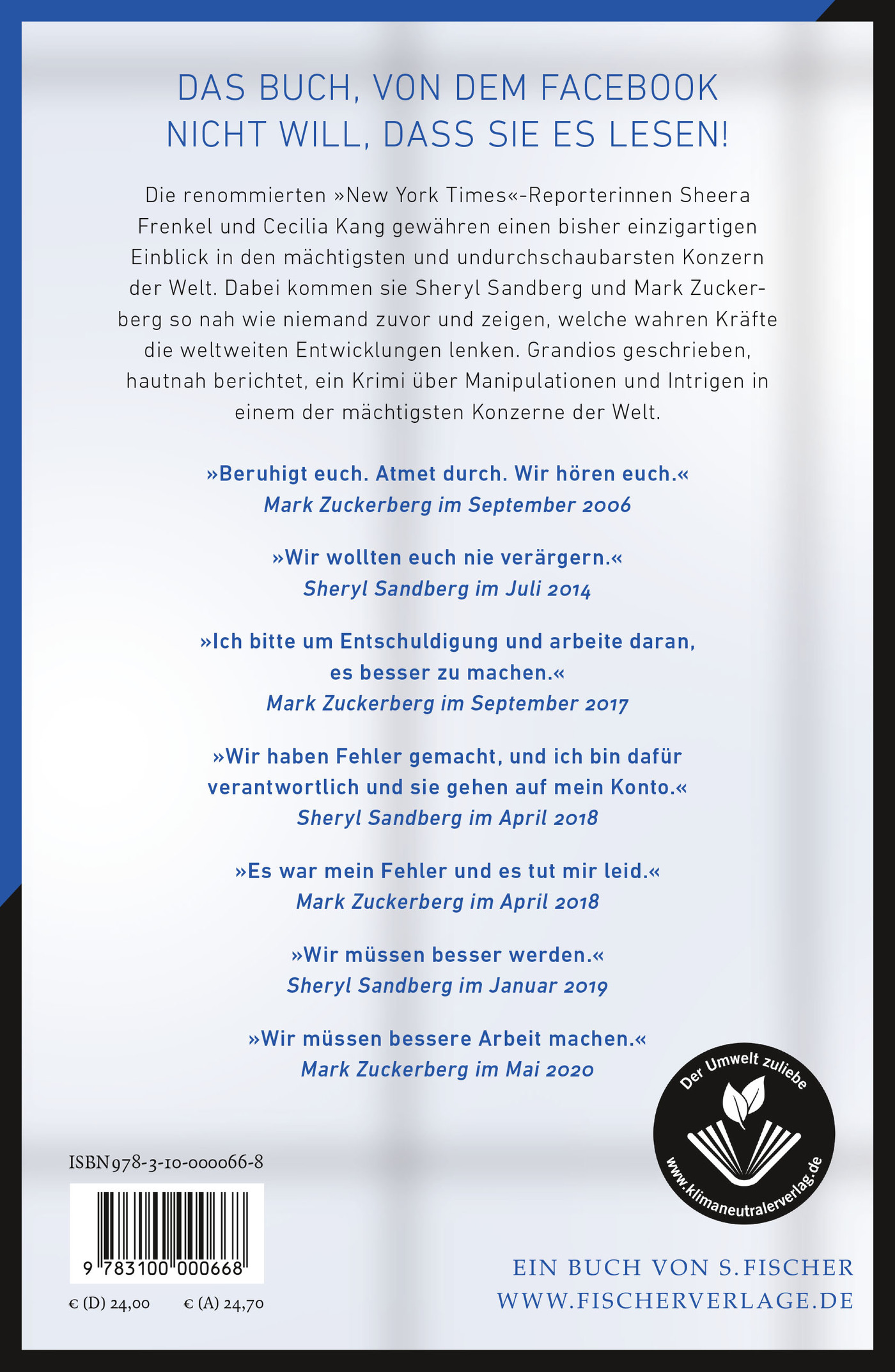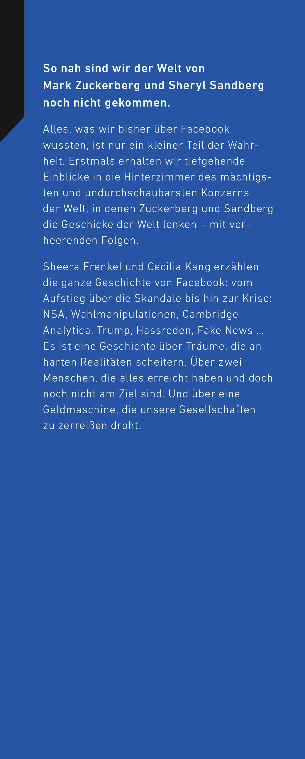 Ausgehend von ihrer langjährigen investigativen Recherche, in der sie über Hunderte von Interviews führten, zeigen uns die Autorinnen ein Facebook, das wir so bislang nicht kannten. Dabei kommen sie Sheryl Sandberg und Marc Zuckerberg so nah wie niemand zuvor. Wir erfahren, welche Rollen Zuckerberg und Sandberg spielen, wie in den Hinterzimmern folgenreiche Entscheidungen getroffen, mit Politikern zwielichtige Absprachen vereinbart und undurchsichtige Netzwerke gebildet werden. Und wie eine Maschine zur Geldvermehrung immer weiter am Laufen gehalten wird, koste es, was es wolle - mit verheerenden Folgen: Aushöhlung der Privatsphäre und der Demokratie, eine Gefahr für unsere Gesellschaften.