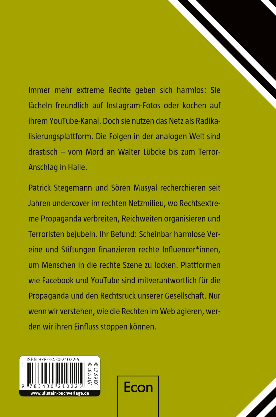 Patrick Stegemann und Sören Musyal recherchieren im rechten Netzmillieu, bewegen sich undercover in digitalen Untergrundnetzwerken, wo rechtsextreme Inhalte verbreitet, Reichweiten organisiert und Rechtsterroristen bejubelt werden. Ihr Befund: Vereine und Stiftungen finanzieren rechte Influencer, um Menschen in die rechte Szene zu locken. Plattformen wie Facebook und YouTube sind mitverantwortlich für die Propaganda und den Rechtsruck unserer Gesellschaft. Nur wenn wir verstehen, wie die neuen Rechten im Web agieren, werden wir ihren Einfluss stoppen können.