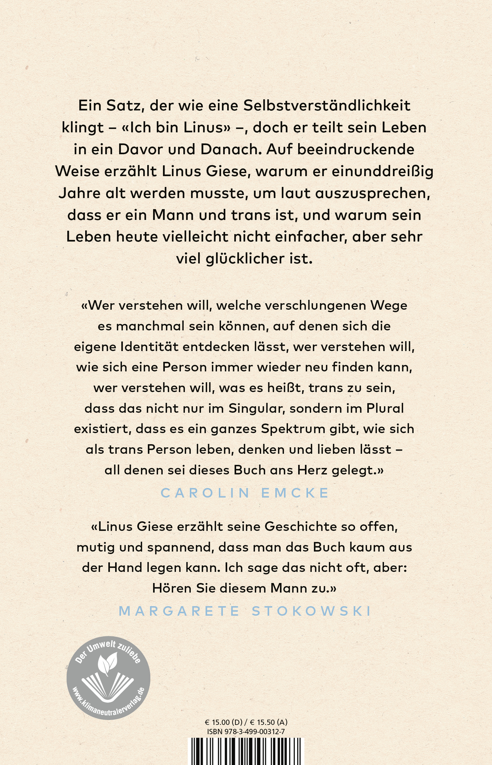 lt;p>Ein Satz, der wie eine Selbstverständlichkeit klingt - «Ich bin Linus» -, doch er teilt sein Leben in ein Davor und Danach. Auf beeindruckende Weise erzählt Linus Giese, warum er einunddreißig Jahre alt werden musste, um laut auszusprechen, dass er ein Mann und trans ist und warum sein Leben heute vielleicht nicht einfacher, aber sehr viel glücklicher ist.
