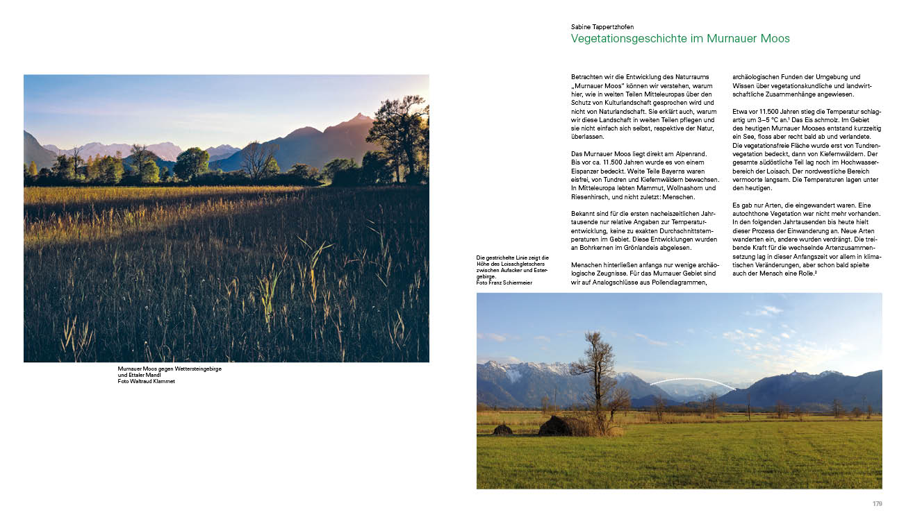 "Das Murnauer Moos kann den Ruhm für sich in Anspruch nehmen, die größten Moortiefen in Bayern aufzuweisen. Nach den Bohrungen der L.f.M. wurden diese mit 15,5 Meter an drei Stellen festgestellt."Dies schrieben Hermann Paul und Selma Ruoff von der Landesanstalt für Moorwirtschaft in München in ihrer epochemachenden Darstellung zur Stratigraphie und Vegetationsgeschichte oberbayerischer Moore 1932. Die Größe des Murnauer Mooses hat sich seit dieser Zeit nicht geändert: Es wurde wie so viele andere Moore nicht zerstört. Mit einer Fläche von 32 Quadratkilometern gilt es heute als das größte zusammenhängende Moorgebiet Mitteleuropas.Seine Bedeutung liegt damit auf der Hand: Im Lauf der letzten Jahrtausende ist es zu einem der bedeutendsten Kohlenstoffspeicher Mitteleuropas geworden. Natur- und Kulturgeschichte durchdringen sich in diesem Gebiet, und das muss im wahrsten Wortsinn verstanden werden: Eine wichtige römische Straße verlief quer durch das Moor. Sie war eine wichtige Datierungsmarke für die Verknüpfung der Moor- und Vegetationsgeschichte mit der Kulturgeschichte. Paul und Ruoff untersuchten die Pollengehalte in verschiedenen Tiefen von Torfprofilen aus dem Murnauer Moos und hofften, einen charakteristischen Ablauf der Vegetationsgeschichte über und unter der Schicht der Römerstraße zu finden.Insgesamt wollte man durch Untersuchungen mehrerer Moore und die Verknüpfung von archäologischen Funden, deren Datierung und pollenanalytische Untersuchungen eine Grundlage für die mitteleuropäische Klimageschichte gewinnen.Mit dem gleichen Ziel untersuchte man das Federseemoor oder auch die Seen und Moore im Umfeld der Ostsee.Oft wagten die Archäologen vorschnelle Schlüsse, zum Beispiel, dass die vorrömische Zeit recht trocken gewesen sei. Doch Paul und Ruoff waren skeptisch: "Wir sehen, dass ein großer Teil der Argumente für trockenes, ja sogar für warmes Klima von den Archäologen stammt. Nicht alle Argumente sind unbedingt zwingender Natur."Heute beachtet man auch andere Indizien für den Klimawandel, schwankende Gletscherstände, unterschiedliche Jahrringbreiten im Holz, Einlagerungen von Sauerstoffisotopen im grönländischen Eis, und man datiert kohlenstoffhaltige Ablagerungen mit C14-Messungen. Aber die internationalen Ansätze, mit denen verschiedene Forschungsansätze zu Beginn des 20. Jahrhunderts miteinander verknüpft werden sollten, imponieren bis heute.Die vielfache Bedeutung als Kohlenstoffspeicher, Standort und Habitat seltener Pflanzen- und Tierarten sowie landschaftliche Schönheit machen das Murnauer Moos zu einem Juwel. Es braucht unseren besonderen Schutz, wobei die Kulturgeschichte nicht vergessen werden darf. Der Rosner & Seidl Stiftung in München ist erstens für die Anstrengungen zur Bewahrung des Murnauer Mooses zu danken und zweitens für die Förderung der Darstellung der Kulturgeschichte des Moores durch Christine Rädlinger. So wird eine wichtige Basis für eine gute Zukunft des Moores gelegt.Hannover im September 2019Hansjörg Küster