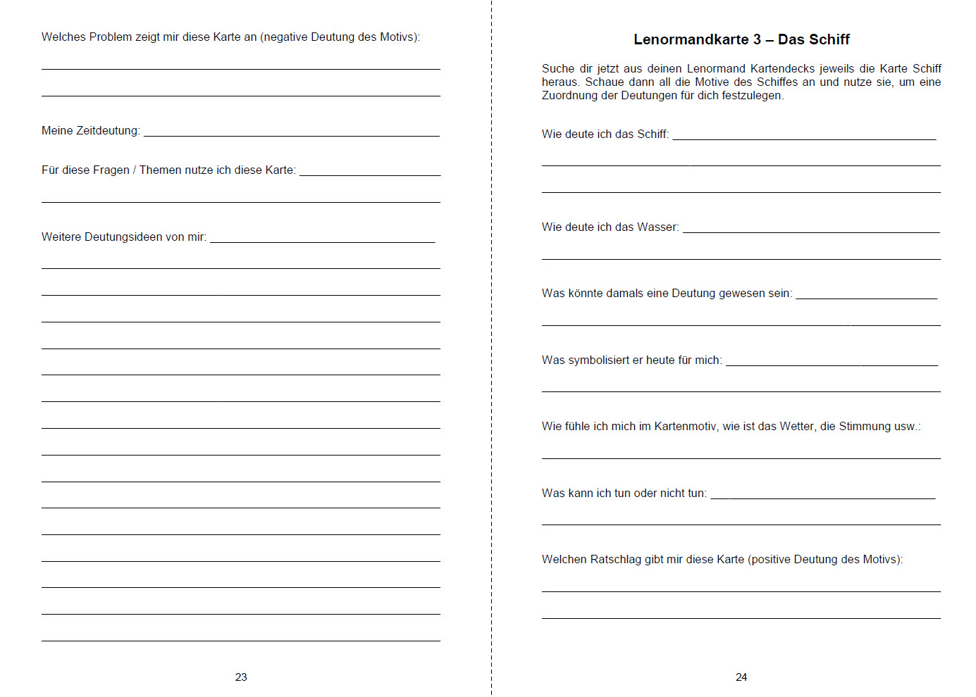 Jeweils 2 Seiten, auf denen du jede einzelne Lenormandkarte genau analysieren kannst.