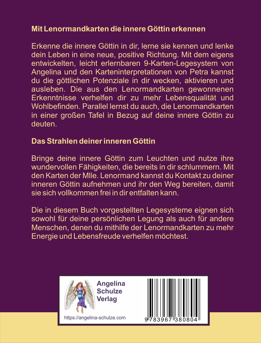 | Schlagworte | Die Göttin • Göttin in Dir • Göttin wecken • Kartenlegen • Kartenlegen ausführlich • Kartenlegen leicht • Kartenlegen lernen • Kartenlegen schnell • Kleine Legung • Legeart • Legemuster • Legesystem • Lenormand • Lenormand Angelina Schulze • Lenormand Bedeutung • Lenormand Buch • Lenormand deuten • Lenormand Deutung • Lenormand Deutungshilfe • lenormand fragen stellen • Lenormandkarten • Lenormand Karten • Lenormand lernen • lenormand orakel • Lenormand Power • Lenormand Schablone • lenormand tafel • Positionsdeutung • Schmetterling Legung • Veränderungen • vertiefende Deutung |