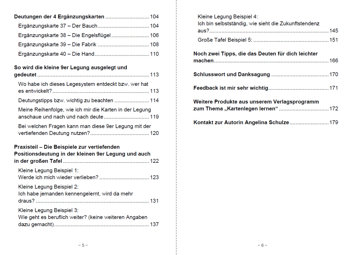 3.Abgerundet wird das Buch mit 5 Legebeispielen, wovon 4 die Praxis in der kleinen 9er Legung zeigen. Das Beispiel 5 zeigt dir die Anwendung in der großen Tafel, also wie du das Deutungskonzept ins große Kartenblatt überträgst und dort zu deinen hilfreichen Antworten kommst.