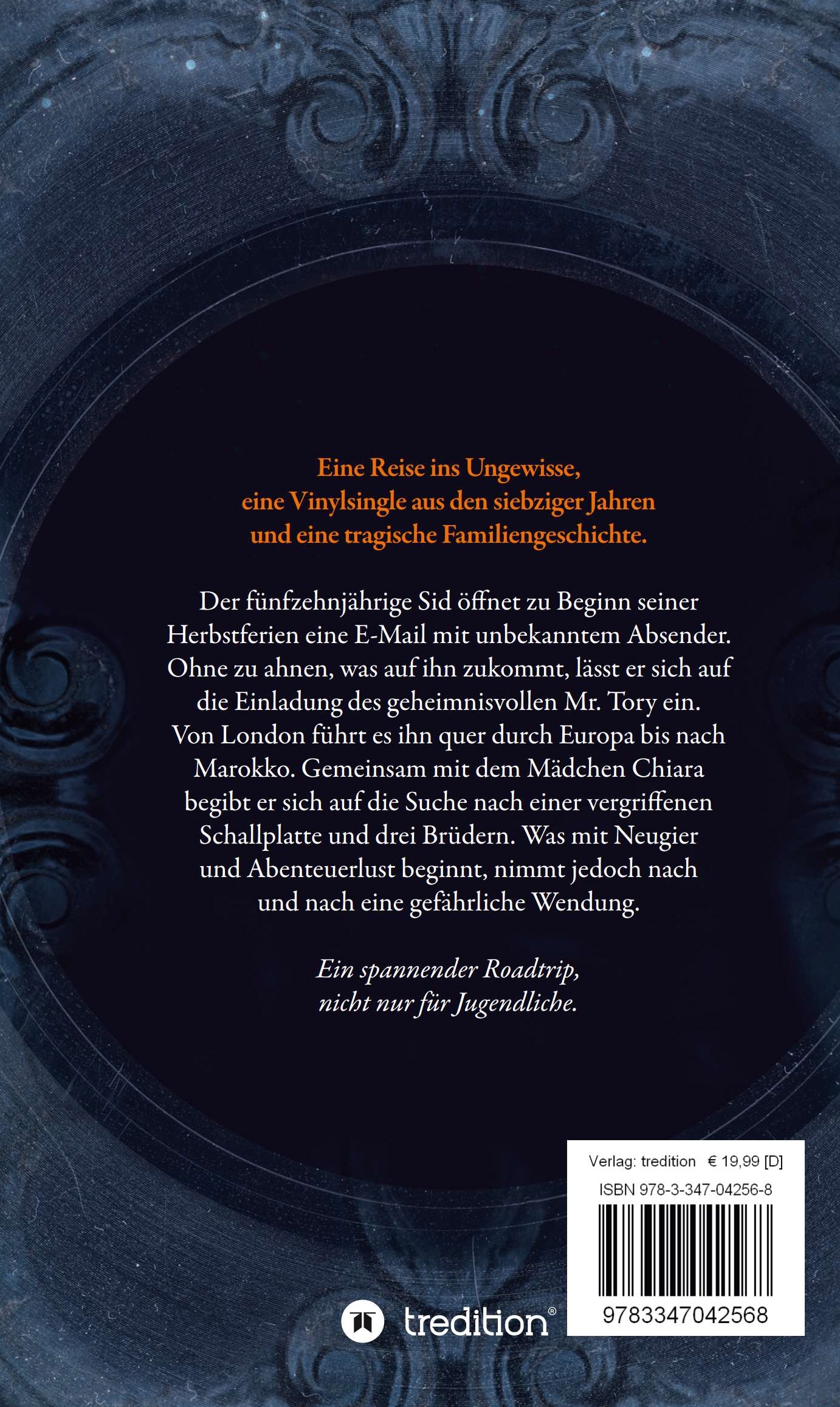 Eine Reise ins Ungewisse, eine Vinylsingle aus den siebziger Jahren und eine tragische Familiengeschichte. Der fünfzehnjährige Sid öffnet zu Beginn seiner Herbstferien eine E-Mail mit unbekanntem Absender. Ohne zu ahnen, was auf ihn zukommt, lässt er sich auf die Einladung des geheimnisvollen Mr. Tory ein. Von London führt es ihn quer durch Europa bis nach Marokko. Gemeinsam mit dem Mädchen Chiara begibt er sich auf die Suche nach einer vergriffenen Schallplatte und drei Brüdern. Was mit Neugier und Abenteuerlust beginnt, nimmt jedoch nach und nach eine gefährliche Wendung. Ein spannender Roadtrip, nicht nur für Jugendliche.